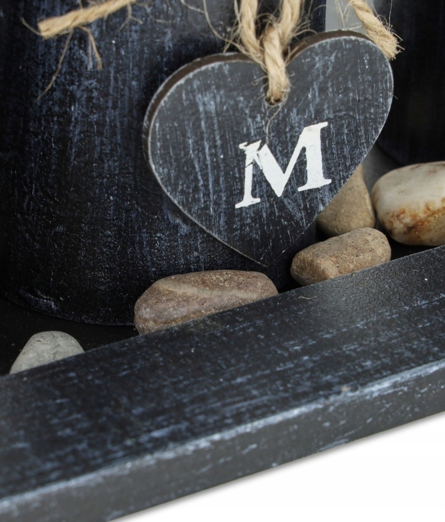 Завдяки набору декоративних свічок, ви можете створити затишну атмосферу вдома. Поздовжній піднос для свічок ідеально підходить як прикраса столу на їстівних столах, але також чудово виглядає на підвіконня, бічному столі або комоді, де тепле мерехтливе світло свічки створює домашній настрій. Чорні дерев’яні свічники для обігрівачів оснащені сердечками з літерами "додому".