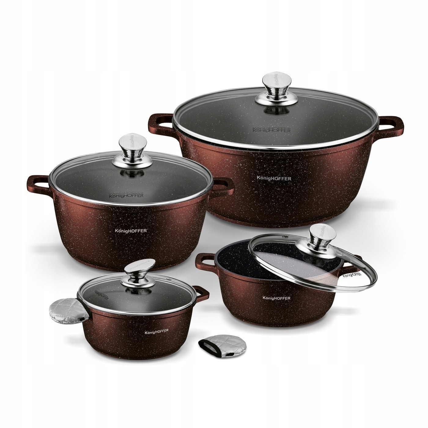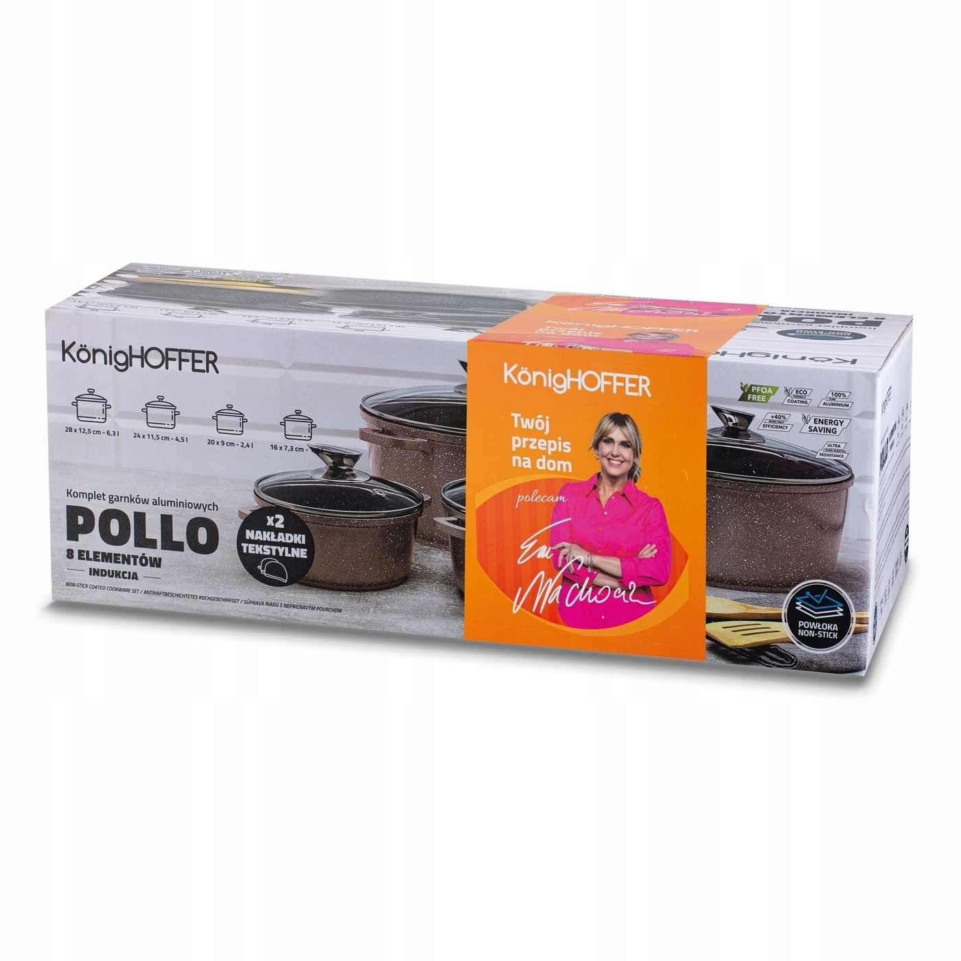 Набір мармурових каструль Konighoffer Pollo Brown із 8 предметів має 2 тканинні кришки для ручок. Набір дозволяє безпечно готувати і смажити, знижуючи ризик обпекти руки. У комплект входять посудини об'ємом від 1,2 до 6,3 л. Каструлі оснащені скляними кришками зі сталевим бортиком для захисту від сколів. Вони також мають стильні ручки з нержавіючої сталі. З набором кам'яних каструль Pollo ви можете готувати на будь-якій плиті. Гранітне антипригарне покриття та мармурове оздоблення алюмінієвих корпусів додають йому елегантності. Вони швидко нагріваються, тому ви заощадите час і енергію. Вони ідеально підійдуть для сімейної кухні або на подарунок. Вони також добре захищені від високих температур і рівномірно проводять тепло. Ви також можете використовувати горщики в духовці при максимальній температурі 220 градусів C. Їх безпечне використання та нетоксичний дизайн для навколишнього середовища позначені маркуванням PFOA Free. Невід'ємною частиною корпусу посуду є литі ручки. Оскільки вони не мають додаткових з'єднань, вони нагріваються разом з каструлею. У зв’язку з цим необхідно використовувати захисні чохли (тканинні, силіконові) або духові рукавички під час переміщення приладу на плиту та з неї та виймання її з духовки, щоб не обпекти руки. Природно, що частина тепла буде відчуватися. Однак тоді його рівень буде підтримуватися на безпечному рівні. Продукт рекомендований Ewa Wachowicz. Як амбасадор бренду Konighoffer, вона тепло та з усмішкою рекомендує його для домашнього використання. Разом з ним ви отримаєте свій рецепт для дому. Це один із найкращих варіантів у цій категорії!