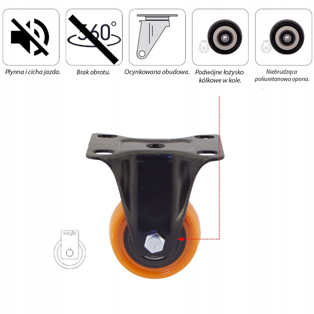 Колесо складається з поліпропіленової втулки та поліуретанової шини, що не залишає слідів, має подвійний кульковий підшипник.
