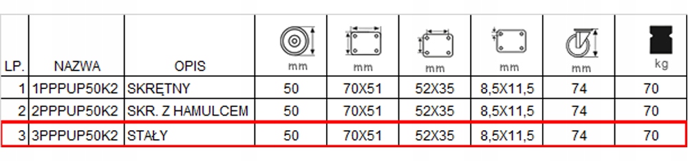 - КОРПУС виготовлений з листової сталі високої міцності. Плитка має розміри 70 мм х 51 мм. Колеса мають діаметр 50 мм, центри кріплення 52 х 35 мм, а овальні отвори 8,5 х 11,5 мм. Загальна висота 79 мм.