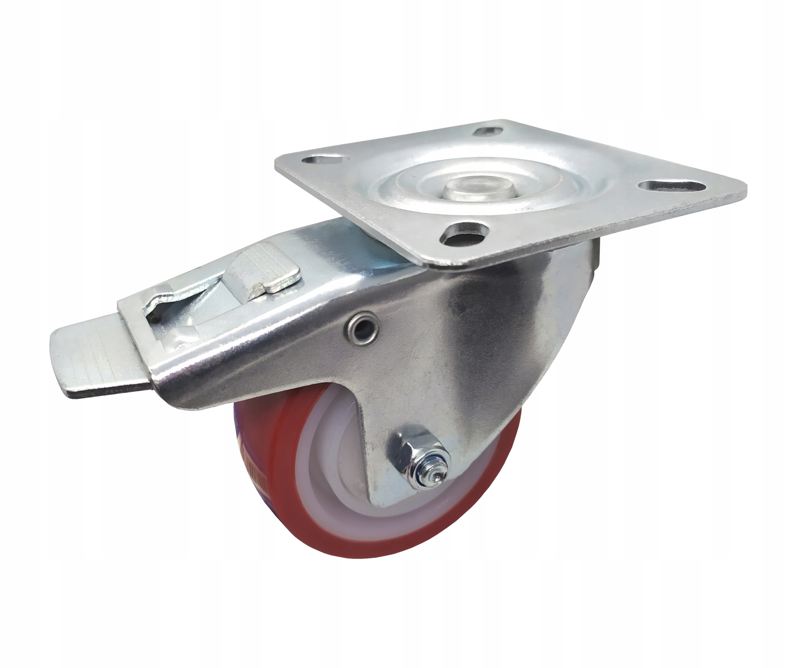 Поворотне колесо встановлене на т.зв. пластина являє собою комбінацію вилки, виготовленої з пресованого сталевого листа, і колеса з білою поліамідною втулкою, оснащеною центральним одинарним кульковим підшипником, протектор виготовлений із литого коричневого поліуретану.