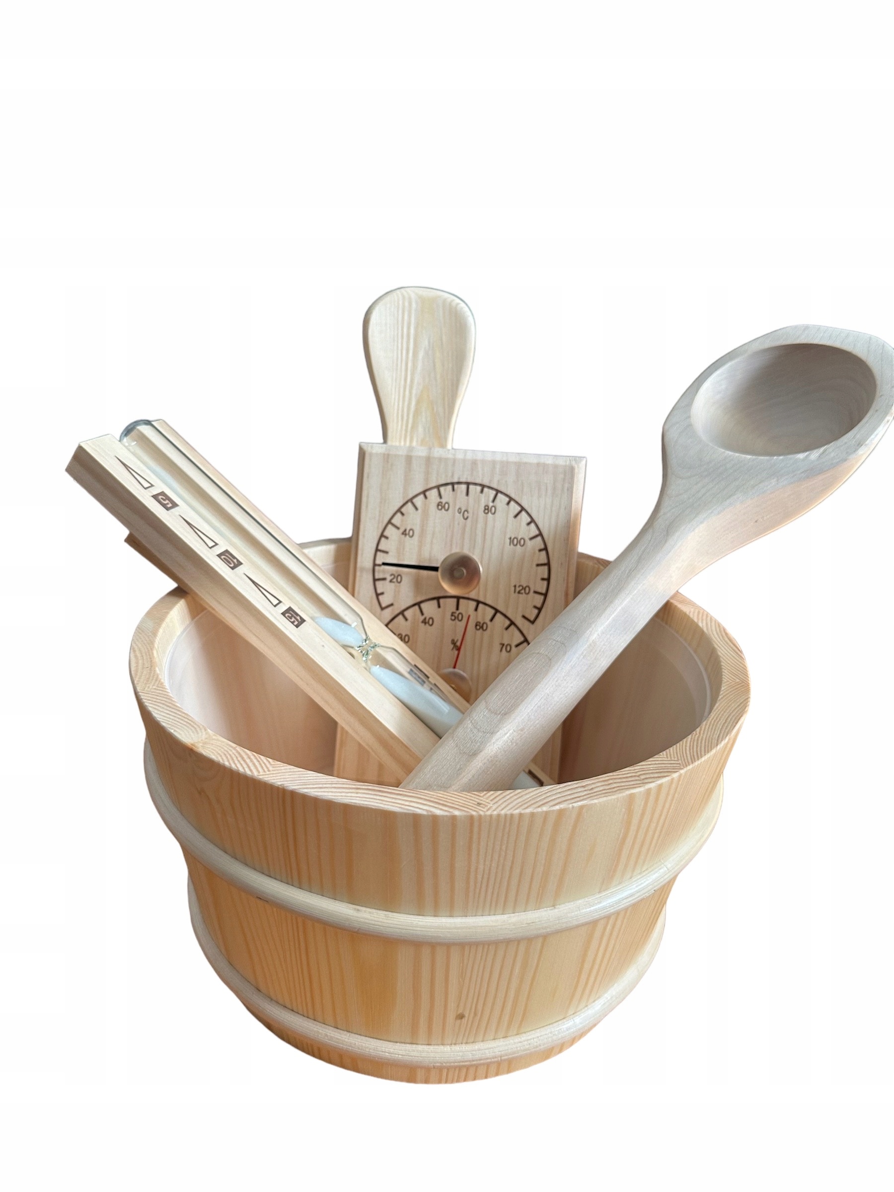 ceber був виготовлений з склеєної ялинової деревини. Всередині він має пластикову вставку, що робить його щільним і гігієні.