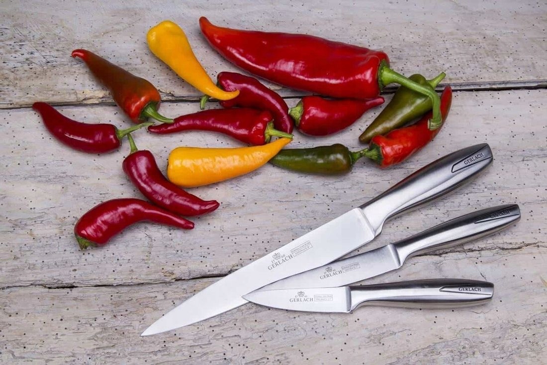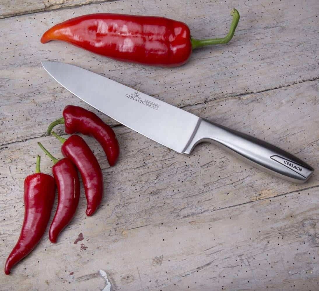 Ми рекомендуємо мити ножі PRESTIGE вручну. Це захистить їх від пошкоджень, які можуть виникнути під впливом високих температур і хімічних речовин. Ножі жорсткі, завдяки цій особливості вони довше залишаються гострими, і власнику не потрібно турбуватися про їх заточування. Однак з такою твердою сталлю можливі розтріскування або відколи. Ножі Gerlach призначені для точного нарізання різноманітних інгредієнтів, а завдяки вбудованій гнучкості вони не ламаються під значним тиском. Це захищає ніж від тріщин або зламу об’єкта.