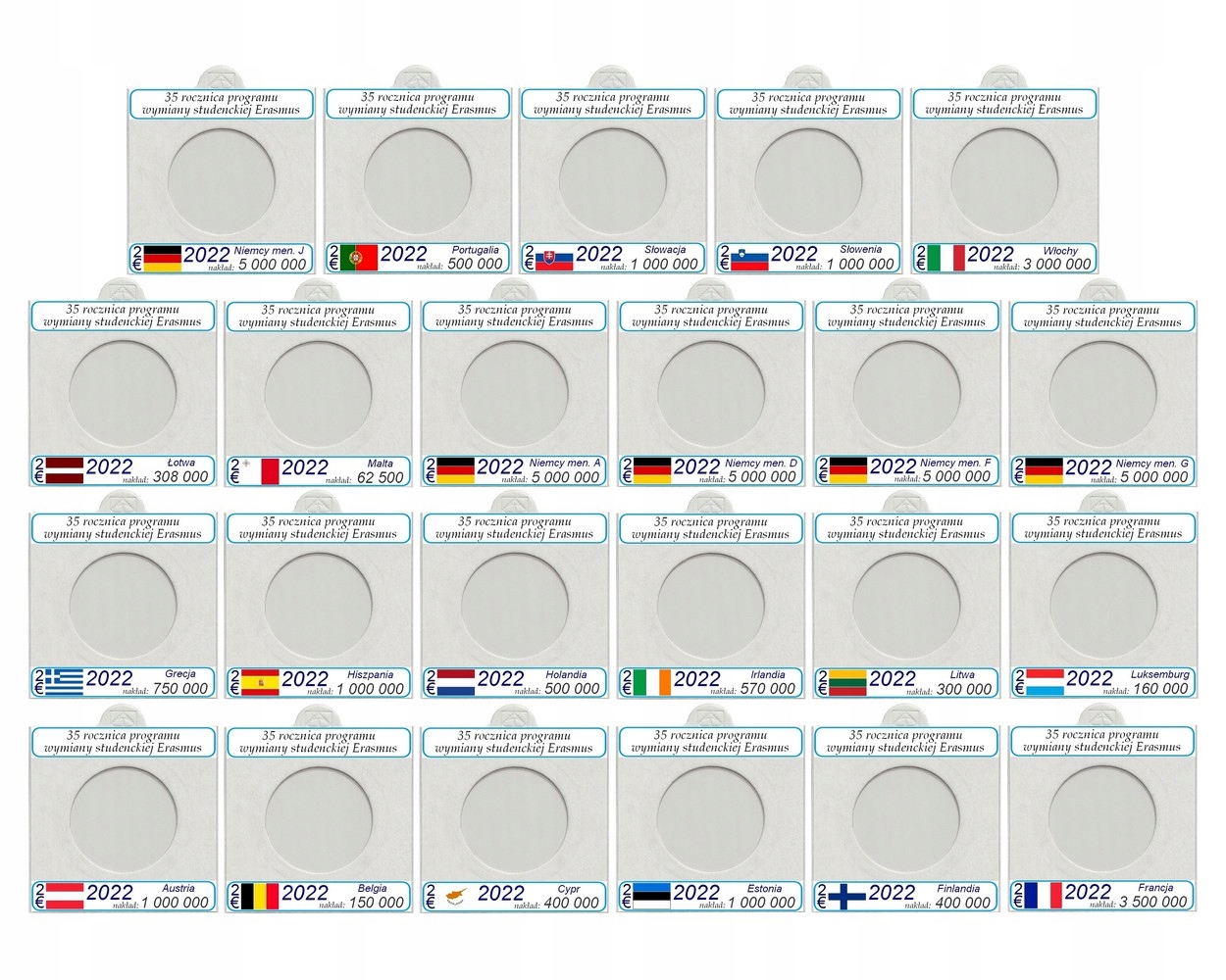 Набір з 57 тримачів для пам'ятних монет 2 євро 2022 року + опис.