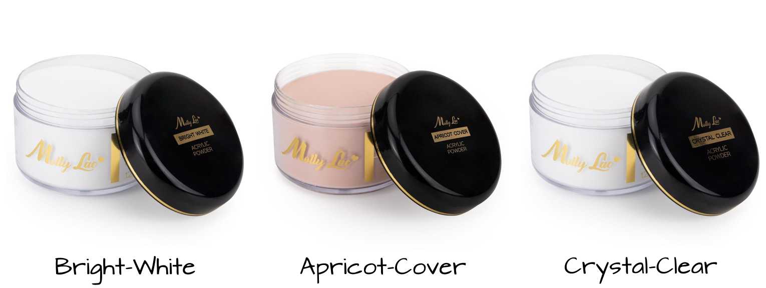 Акрилові пудри MollyLac ідеальні, за текстурою нагадують розсипчасту пудру. Крім того, вони стійкі до кристалізації, не жовтіють під впливом сонячних променів, а також їх додатковою перевагою є простота обробки.