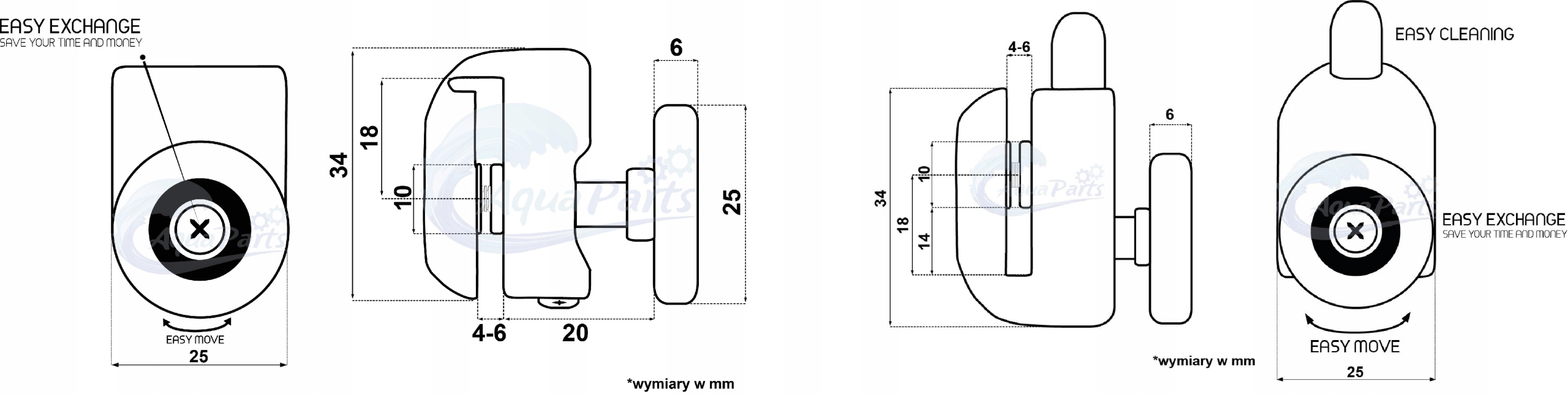 - EASY MOVE Візки з колесами регулюються адаптується до форми направляючої