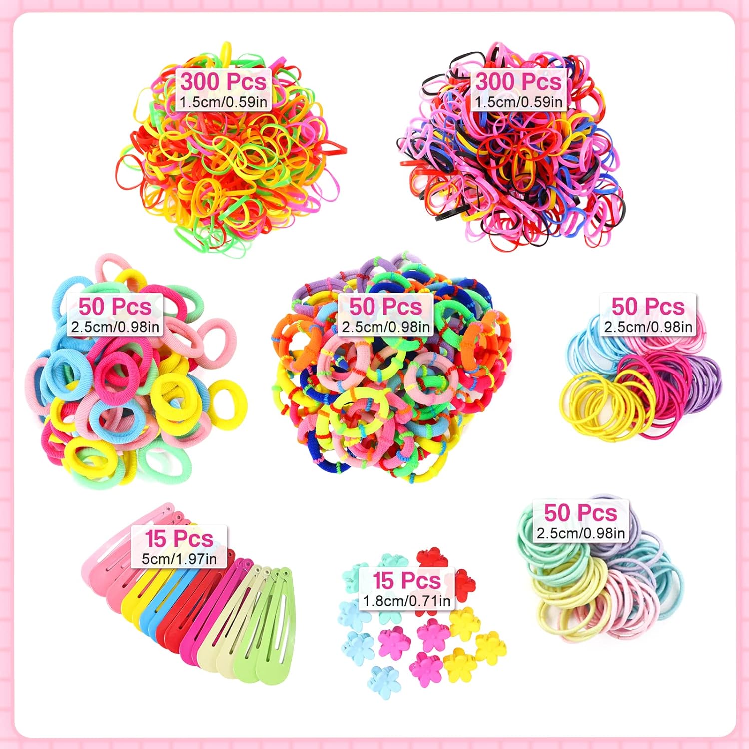 - 830 шт.: Набір заколок для волосся включає 600 шт. маленьких гумок, 100 шт. нейлонових кісок, 100 шт. бавовняних кісок, 15 шт. 15 притискних затискачів. Усі кольори гумок є випадковими.