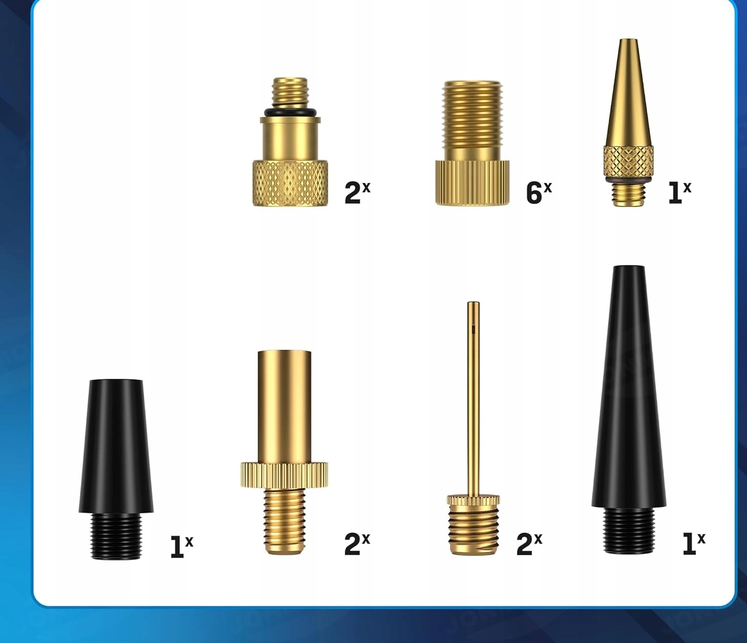 Набір адаптерів для клапанів – це комплексне рішення для тих, хто використовує повітряні насоси та різні клапани. У набір входять адаптери для автомобільних клапанів (AV), французьких клапанів (SV), велосипедних клапанів Dunlop (DV), а також голки для надування м'ячів і конічні наконечники для матраців і надувних іграшок.