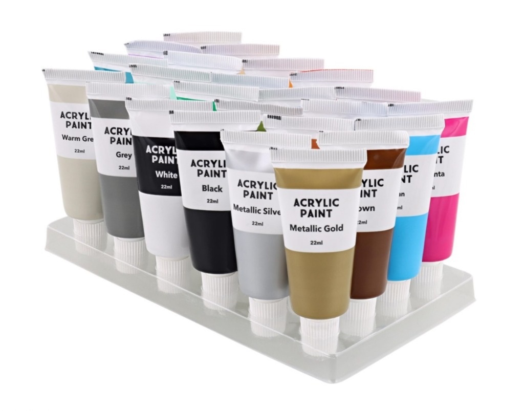 НАБІР АКРИЛОВИХ ФАРБ 22 МЛ або картон, але також можна використовувати акрилові фарби для малювання дерева, скла або глини. Роботи, створені за допомогою акрилових фарб, мають яскраві та стійкі кольори.