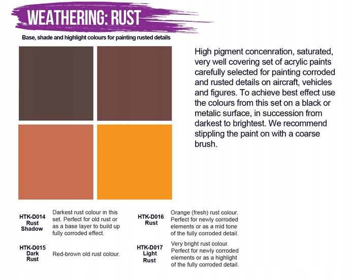 фіолетові лінії акрилові фарби - вивітрювання: іржа. Висока концентрація пігменту, насичена, дуже добре покриває набір акрилових фарб, ретельно відібраний для малювання, корозійних та іржавих деталей літаків, транспортних засобів та статуетки. Щоб отримати найкращий ефект, використовуйте кольори з цього набору на чорній або металевій поверхні, щоб від найтемнішого до найлегшого. Ми рекомендуємо нанести фарбу з товстою щіткою.