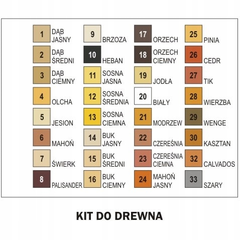 Ми пропонуємо 32 кольори шпаклівок для дерева, призначених для реновації різних дерев’яних поверхонь з дуба, вільха, чорне дерево, ясен і червоне дерево, сосна, ялина, бук, палісандр, вишня, тик або кедр.