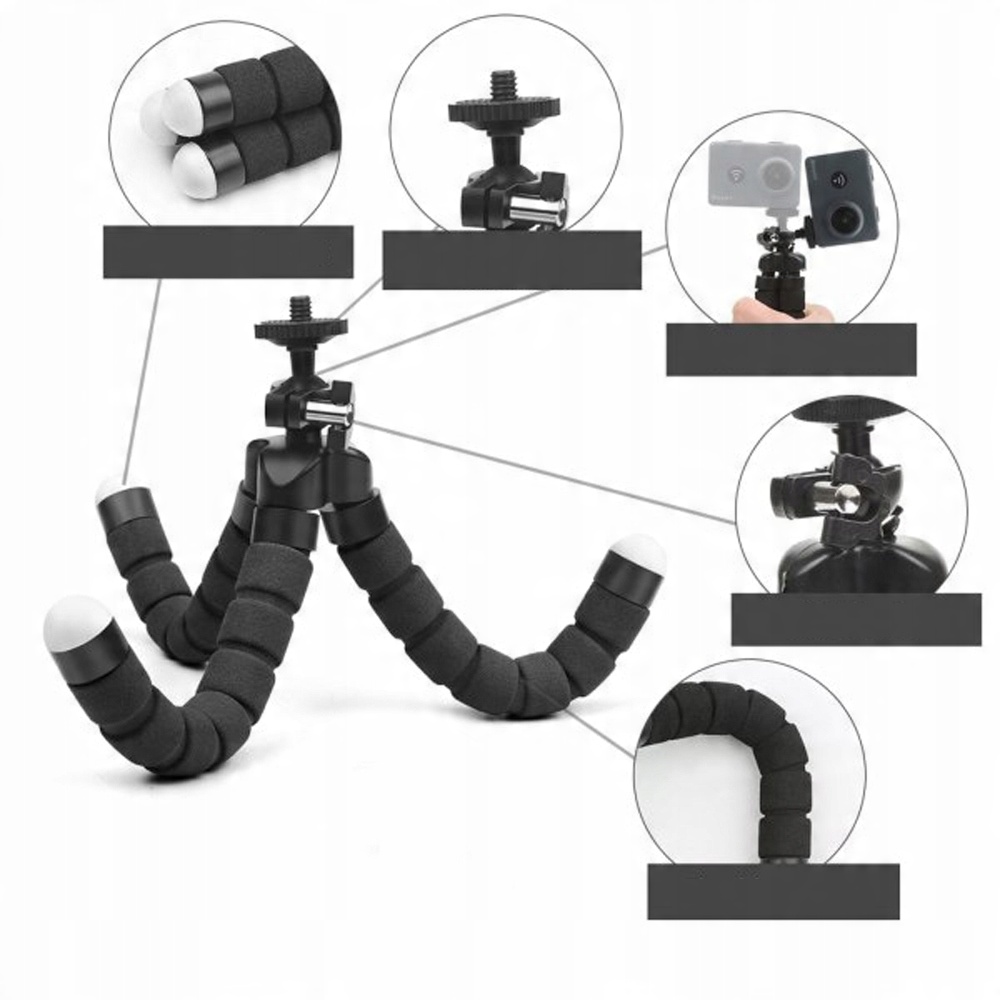 Штатив, обшитий м'якою губкою, дозволяє кріпити наше обладнання практично в будь-якому місці та на будь-якому об'єкті. Річки штатива гнучкі їх можна вільно згинати в будь-якому напрямку. Їх наконечники покриті протиковзкою гумою, тому гаджет можна використовувати і як підставку. Голова, на яку ми встановлюємо камеру, встановлена на сферичному конекторі, завдяки якому ми можемо регулювати її нахил.