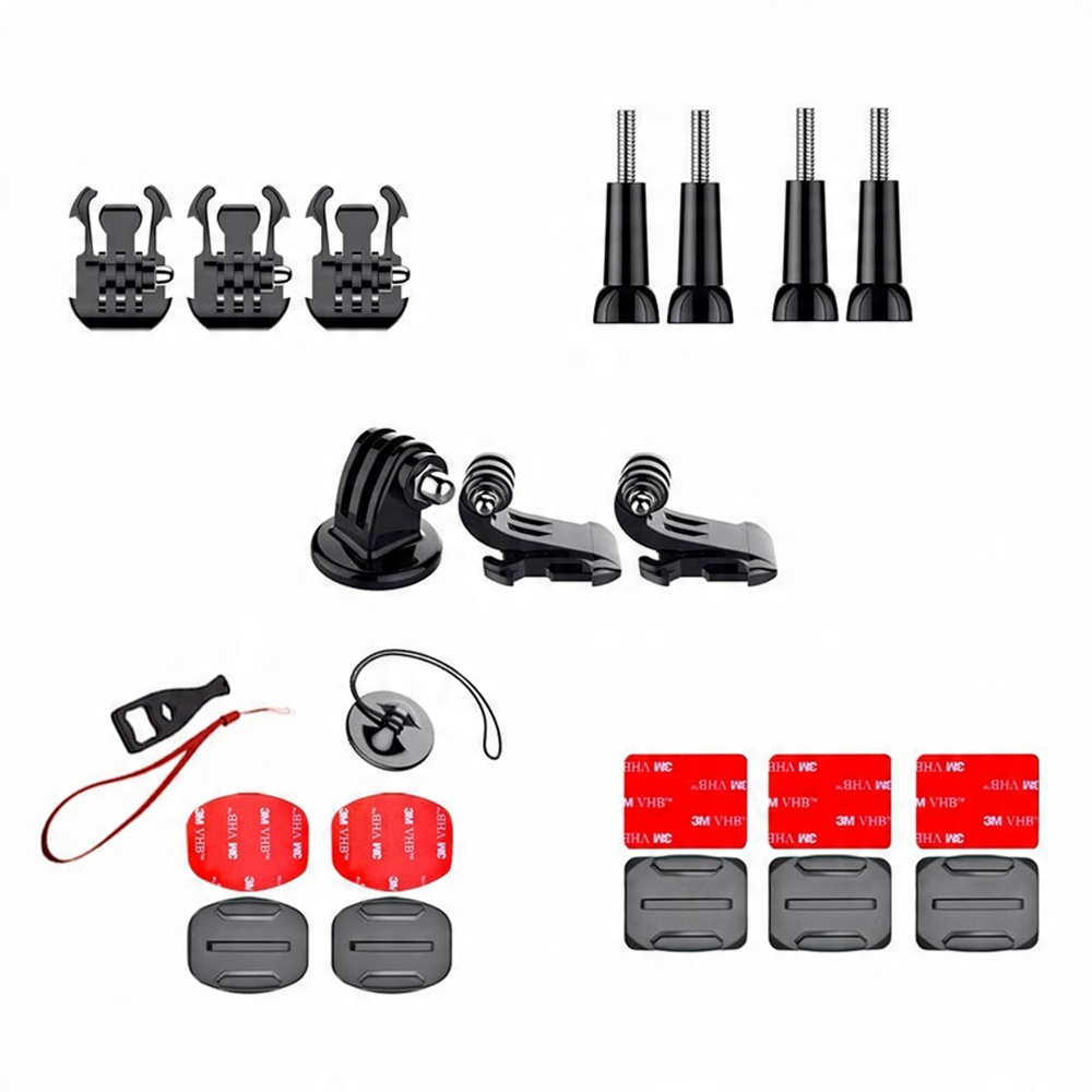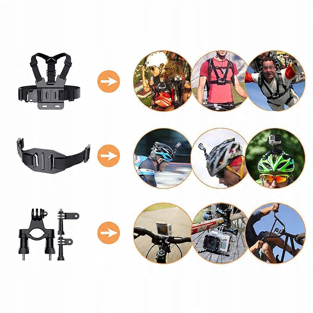 - Величезний повний набіруніверсальних аксесуарів, які підходять для більшості спортивних камер, доступних на ринку