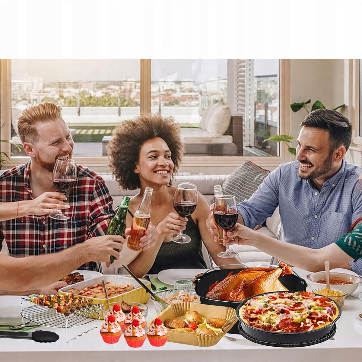 1 квадратний контейнер для торта, 1 форма для піци, 1 тримач для шампурів із 5 шампурами, 1 силіконова підставка, 1 затискач для їжі, 5 силіконових форм для мафінів, 100 квадратних паперів для випікання (не нагрівайте у фритюрниці лише папір для випікання!). Завдяки цьому ви розширите свої кулінарні можливості, отримаєте задоволення від приготування їжі та задовольните потреби всієї родини.