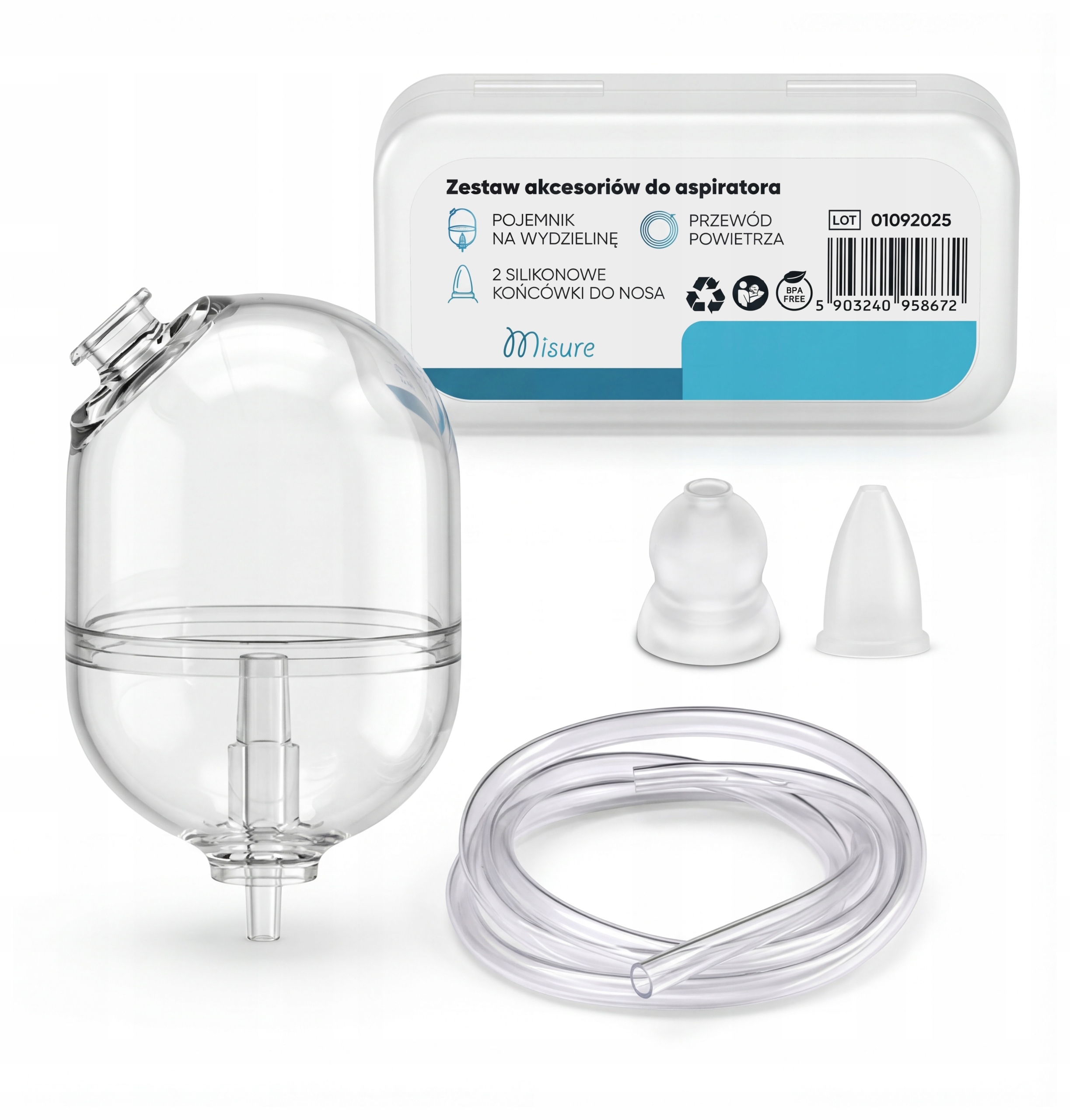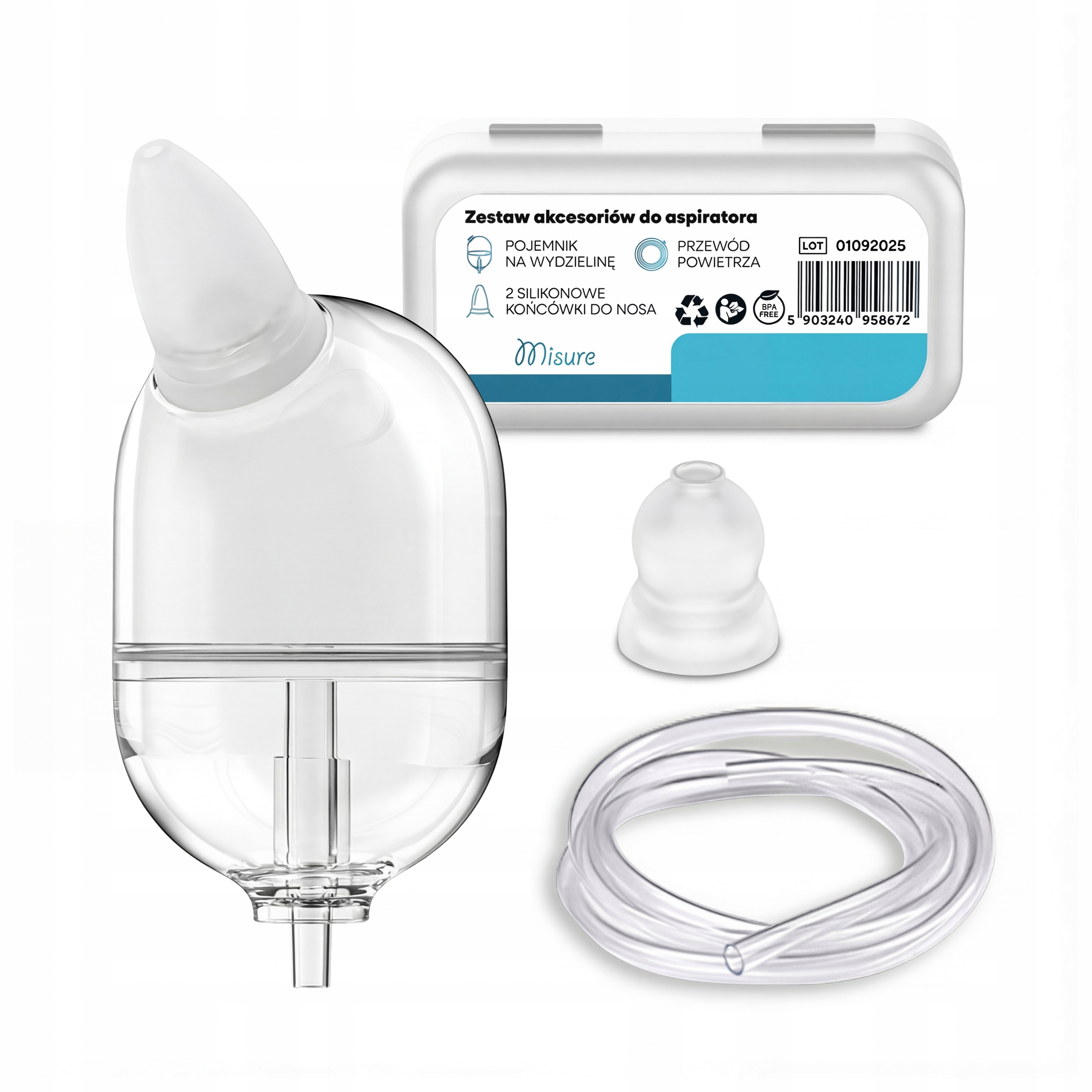 Набір аксесуарів Misure створений, щоб забезпечити батькам безпечний, гігієнічний та ефективний догляд за носом дитини. У набір входять найважливіші робочі елементи аспіратора: контейнер для виділень, два силіконових наконечника і повітряна трубка, які дозволяють швидко відновити повну працездатність пристрою.