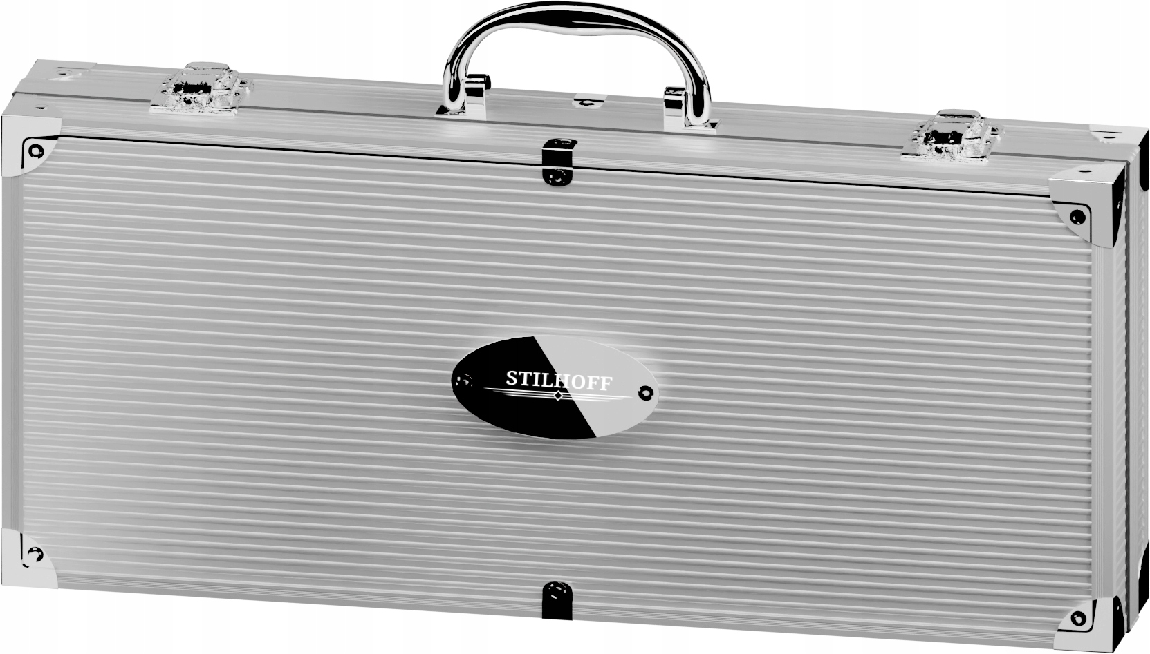 - Сильна алюмінієва валіза - набір барбекю упакований у дуже міцну валізу, виготовлену з алюмінію. Він має ергономічну ручку, яка дозволяє зручно передати та транспортувати. Ми можемо легко відвезти її до друзів або в поїздку.