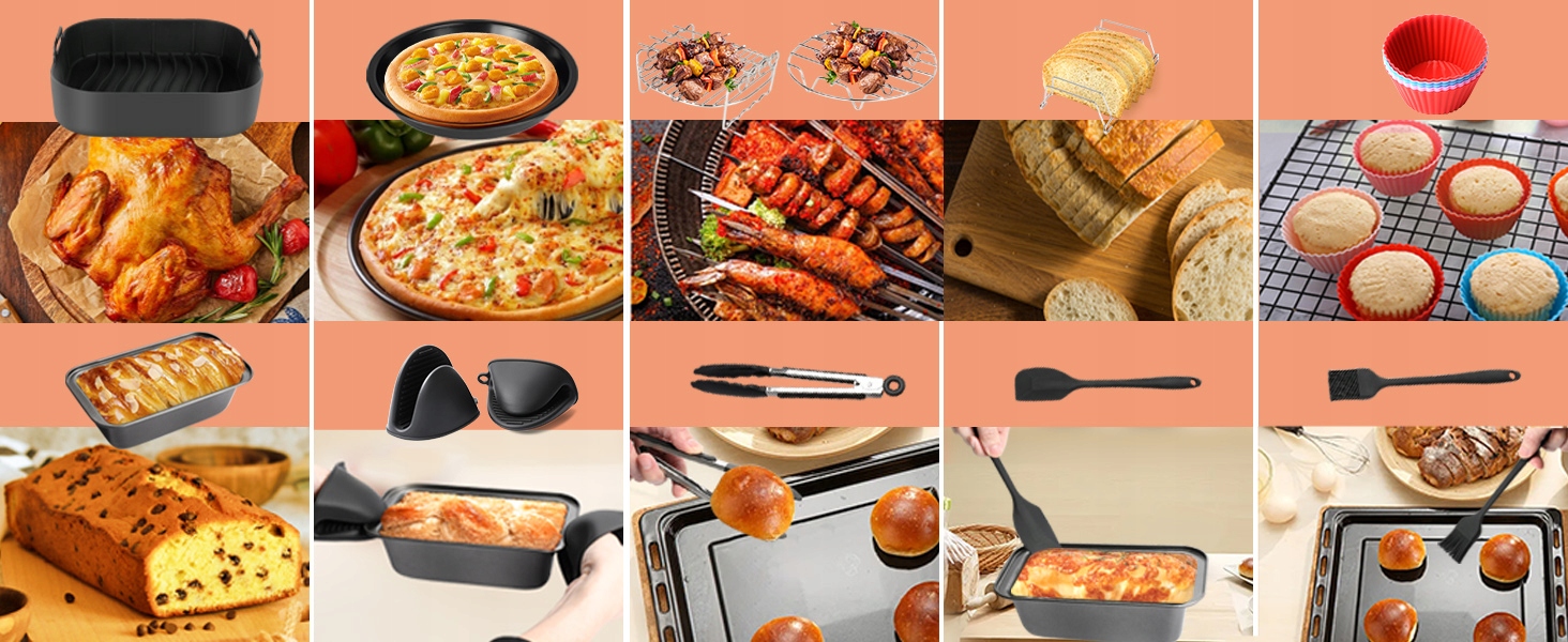 【Набір аксесуарів для аерофритюрниці з 16 предметів】Наш набір аксесуарів для аерофритюрниці включає 1 вставку для аерофритюрниці, 1 деко для піци, 1 металевий тримач, 1 багатофункціональну решітку для 4 шампурів, 1 решітку для тостів, 6 силіконових форм для мафінів, 1 форму для кексів, 2 силіконові рукавички, 1 харчові щипці, 1 лопатку та 1 олію пензлик. Цей повний набір аксесуарів для аерофритюрниці підходить для 99% страв у аерофритюрниці та задовольнить потреби всієї родини.
