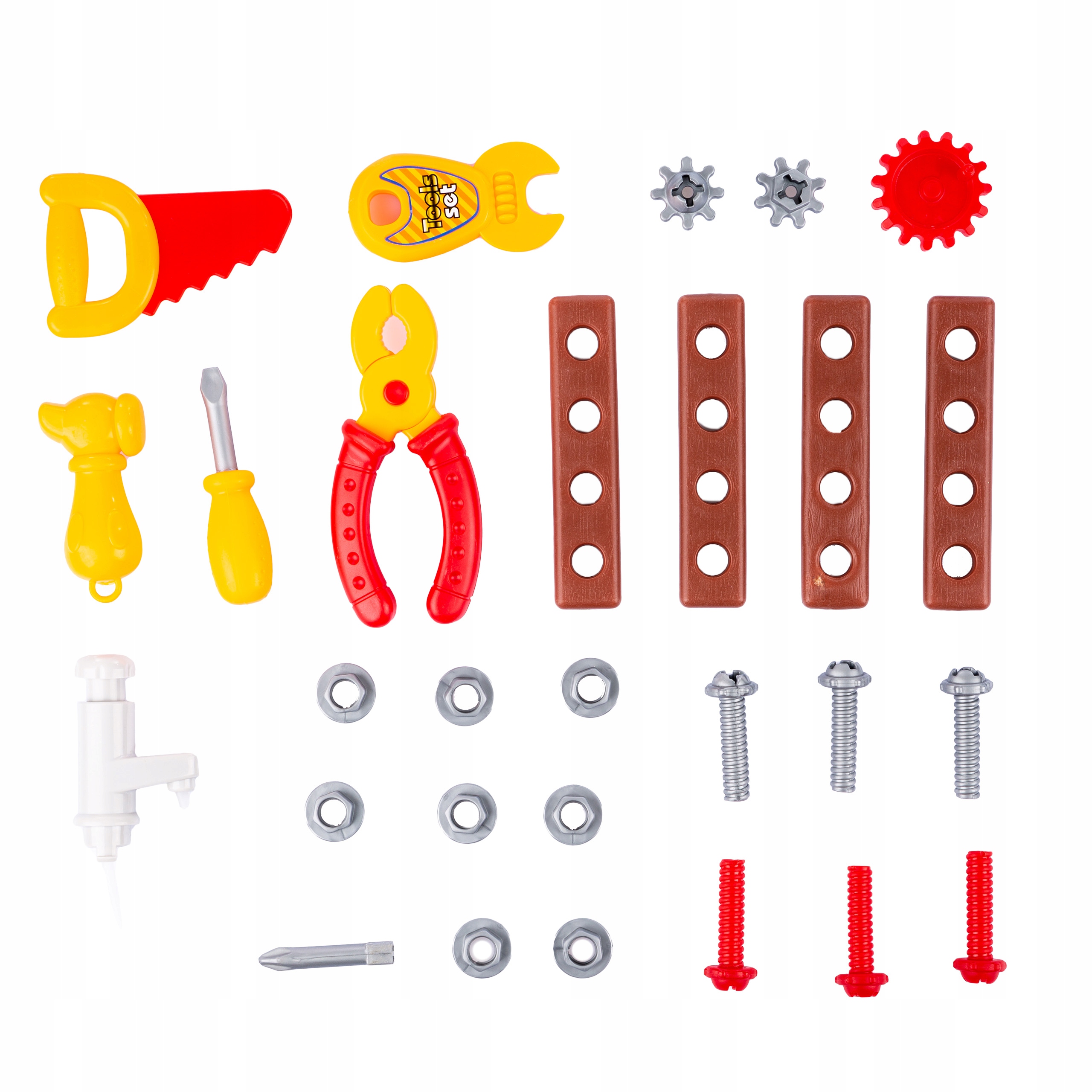 В набір з майстернею входять: пила, гайковий ключ, плоскогубці, викрутка, молоток та інші аксесуари (шурупи, гайки, імітації) з дерева для з’єднання гвинтів тощо).