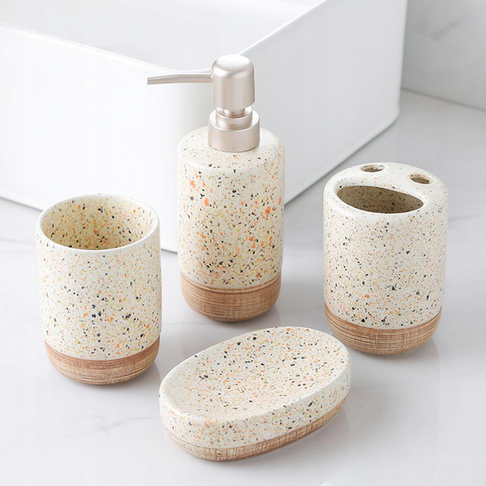 [Packaging contents]: The fashionable set of accessories contains 1 mouthwash, 1 toothbrush holder, 1 bottle with lotion (380 ml) and 1 soap dish