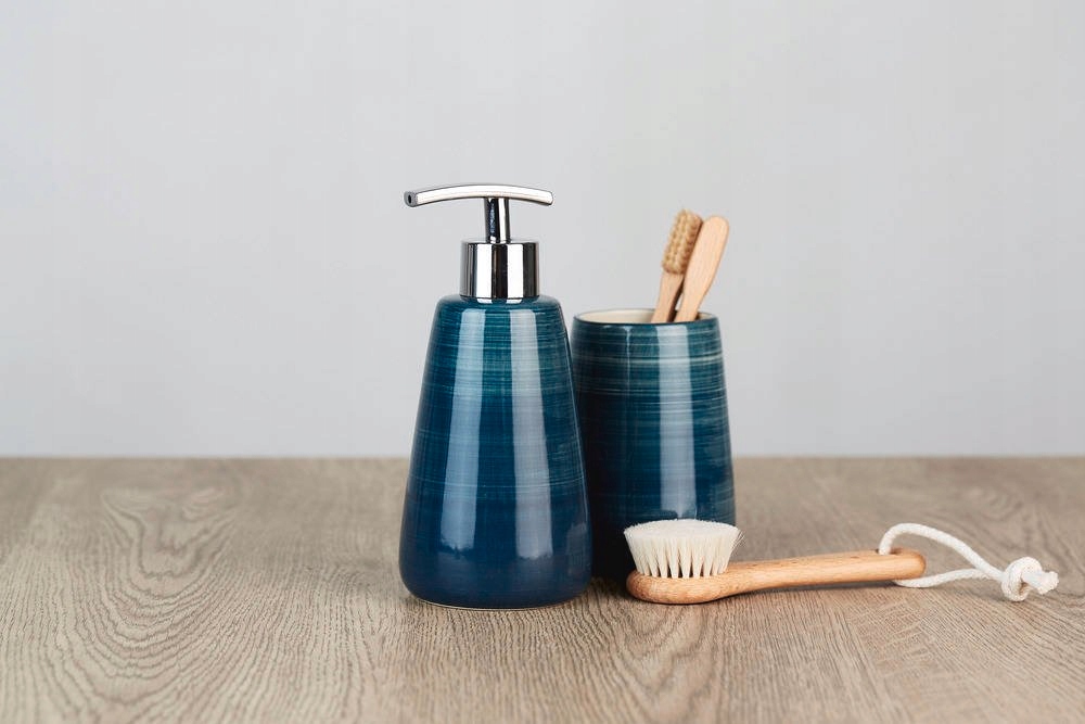 Привабливий набір для ванної POTTERY PETROL: контейнер для зубної щітки, дозатор для мила та контейнер для туалетної щітки зі щіткою. Набір підходить для стильних інтер'єрів, натхненних природою. Весь виготовлений з якісної кераміки, розписаної вручну, можливі відмінності у відтінках. Відкритий контейнер для щіток з щіткою діаметром 7,5 см з металевою ручкою і змінним наконечником.