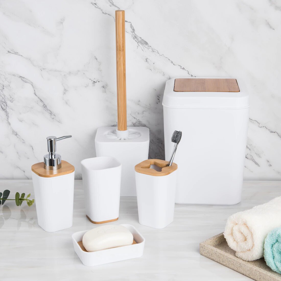 З цим набором ви отримаєте всі аксесуари, необхідні для інтер'єру ванної та туалету. Набір із 6 предметів складається з відра для сміття, туалетної щітки, чашки для зубної щітки, кухля, мильниці та дозатора мила. Вироби виготовлені з високоякісного пластику та екологічного бамбука.
