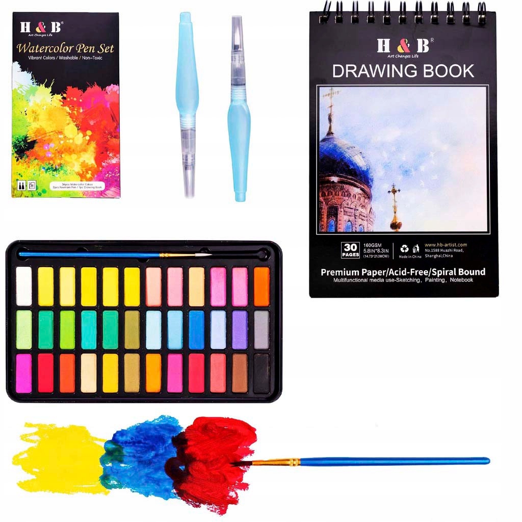 Набір містить цілих 36 різних кольорів на зручній палітрі, дві професійні водяні кисті, звичайну кисть і цілий аркуш спеціального паперу для малювання на жорсткому диску. Ви можете малювати прямо з коробки!