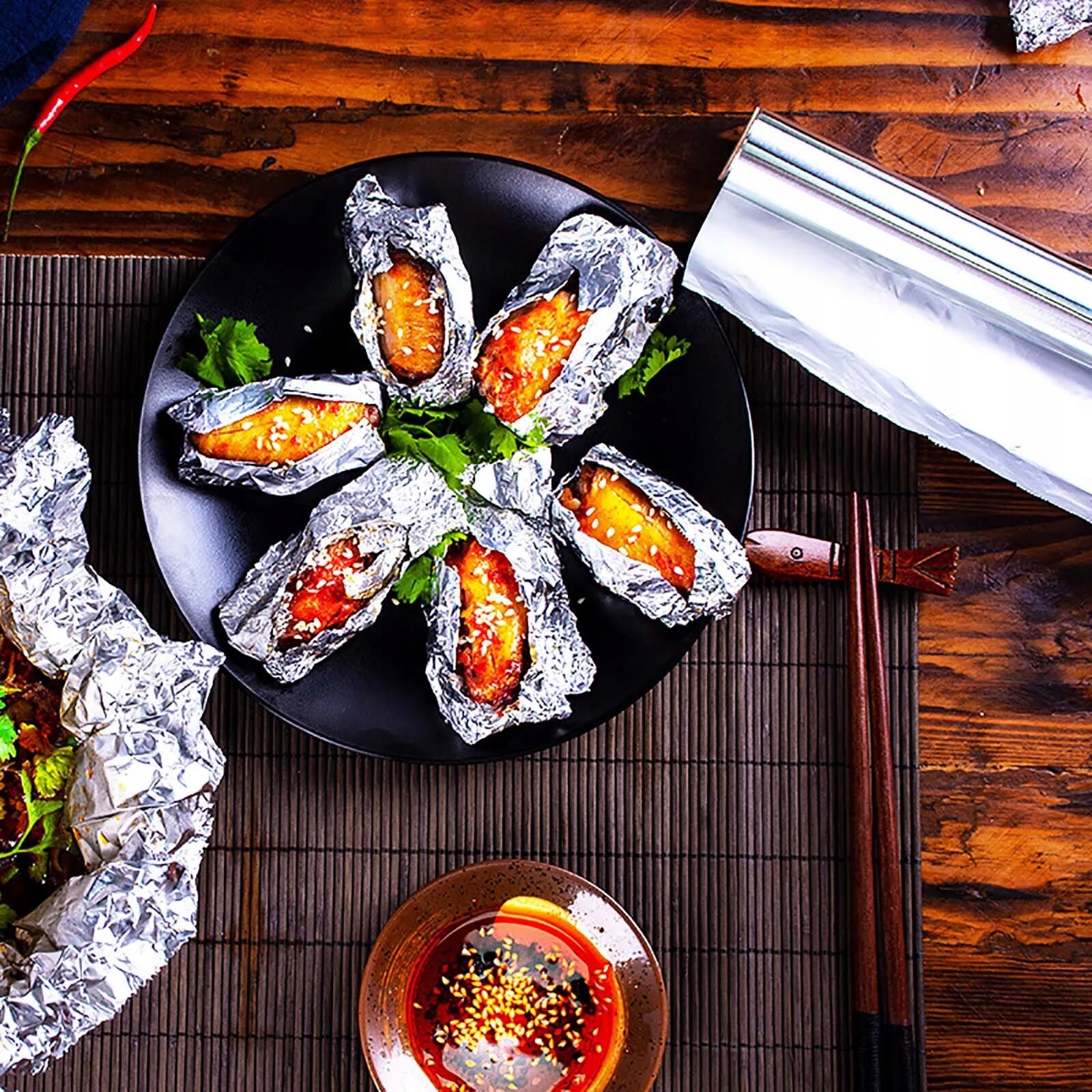 ✔ Алюмінієва фолія ідеально підходить для упаковки та захисту їжі від сушіння та втрати харчової цінності під впливом світла. Крім того, він ідеально підходить для випічки, смаження та грилю. Ідеальний продукт для готелів, ресторанів, барів, піцерій та громадських компаній.
