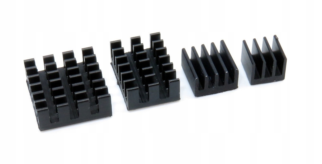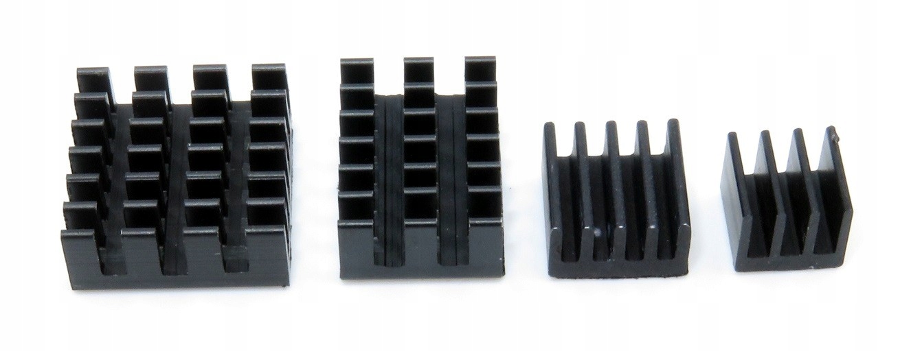 Набір з чотирьох алюмінієвих радіаторів для міні-комп'ютерів Raspberry Pi 4 модель B. Вони дозволяють для додаткового відведення тепла від ключових компонентів на платі. Вони оснащені самоклеючою стрічкою для полегшення монтажу радіаторів.