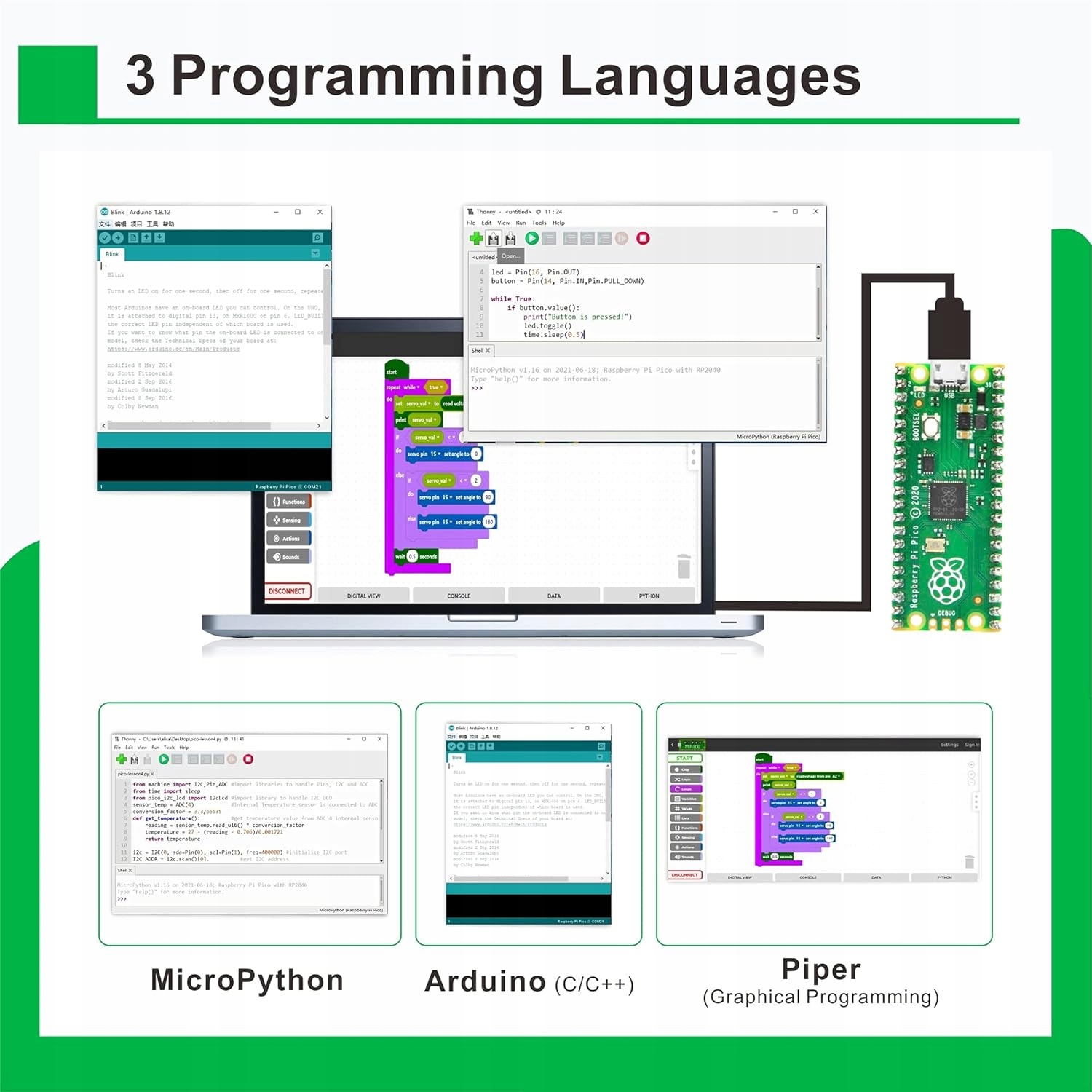 - Ми гадали багато цікавих і практичних проектів для вас, і зібрали багато авторитетних, пов’язаних із цим, просто увімкніть свій комп’ютер, і ви можете завершити народ програмування. Запропонуйте 3 програми: Micropython, Arduino (C/C ++) та Piper (графічна програма). Ви можете бачити різні фактори відповідно до ваших потреб.