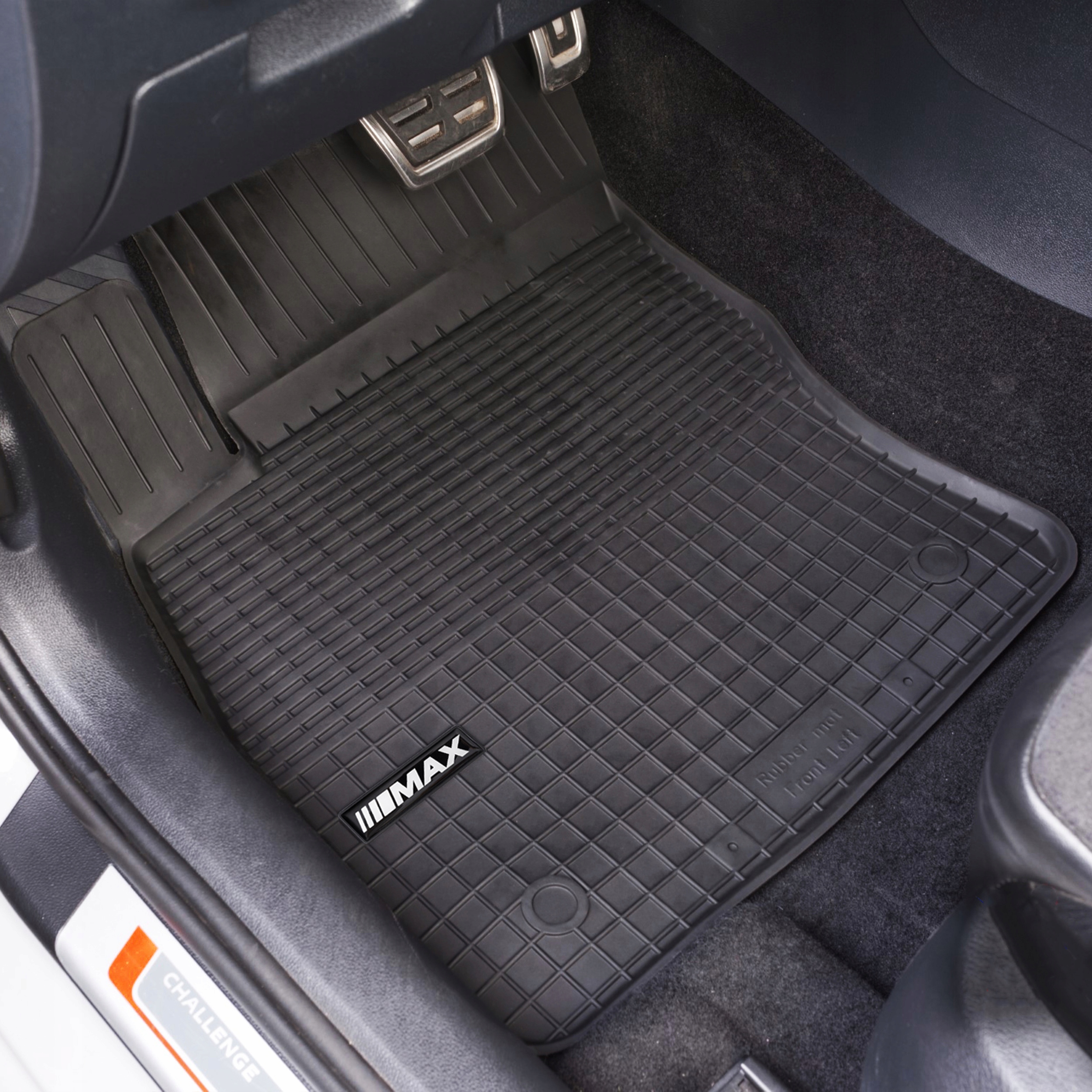 Гумові килимки для передньої та задньої частини автомобіля з елегантною емблемою MAX на водійському килимку.
