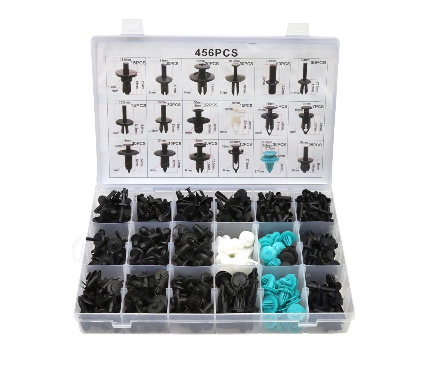 Великий набір затискачів, розширювальних і монтажних штифтів, які використовуються в усіх найпопулярніших марках автомобілів. Набір складається з 456 деталей.