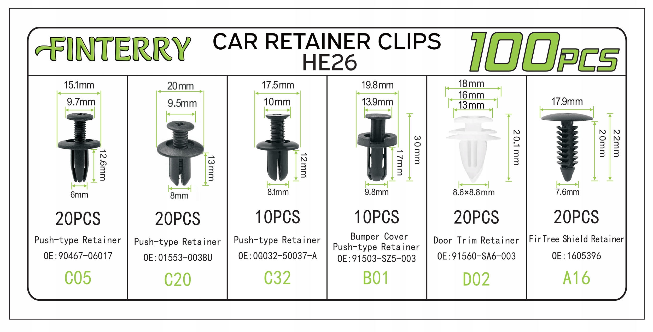 Набір містить 100 елементів високоякісні пластикові затискачі 6 різних розмірів, завдяки яким монтаж і демонтаж деталей оббивки відбувається легко і без пошкоджень.
