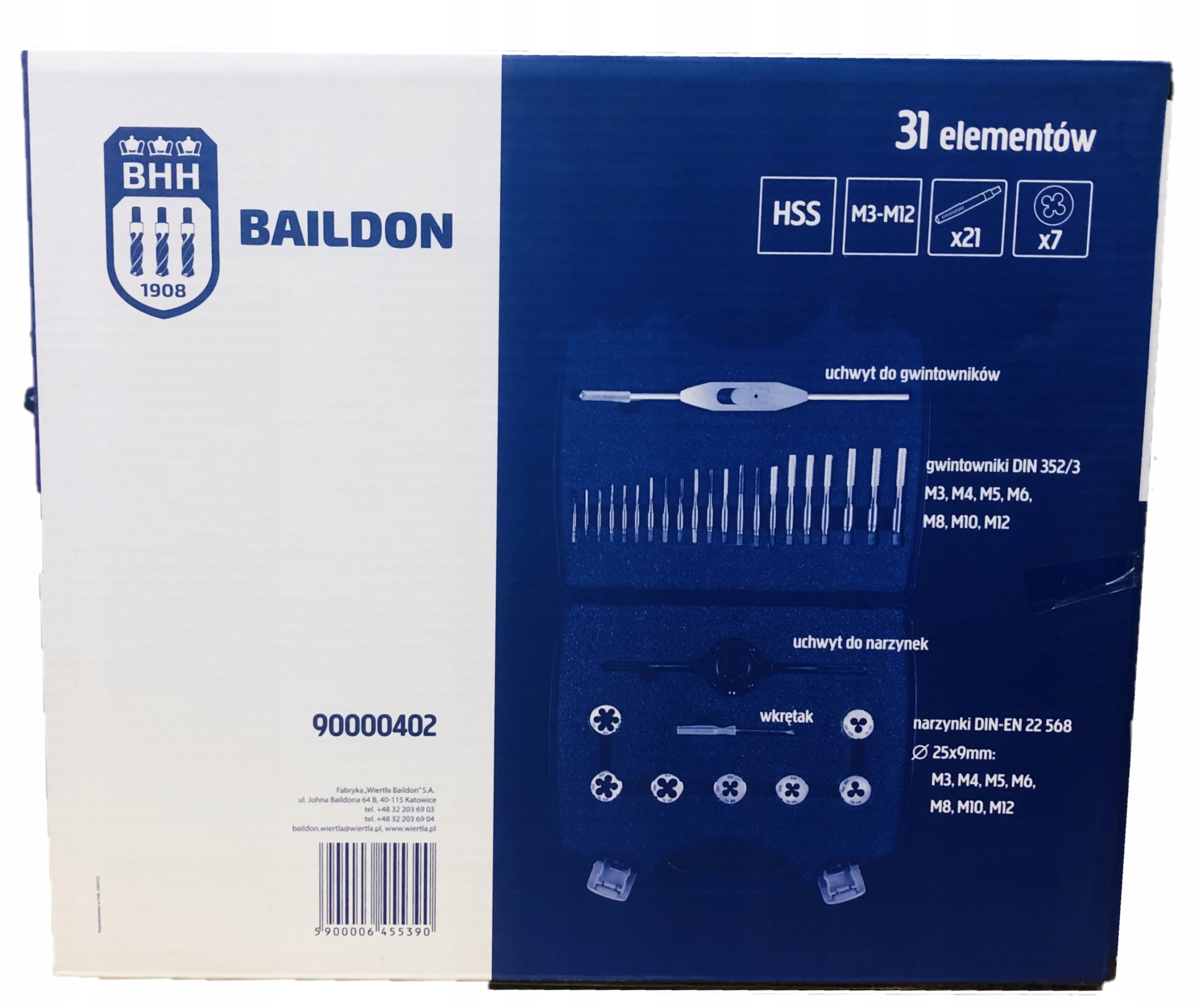 Набір нитків і Narzynek, HSS M2, 31 PCS. 90000402 BAILDON-це набір інструментів для різьблення, що містить ручні нитки DIN-352/3, пропонується в 3 штуках: розпушувач, непряма та обробка, Din-en 22 568, ручка міхура, ручка міхура, рама та практичний пластик. Валізу, оснащена розпіркою, що запобігає зміщенню елементів. Інструменти виготовлені з високої швидкості HSS M2 (6542). Набір пропонує нитки в розмірах: M3, M4, M5, M6, M8, M10, M12 та Narrówka в розмірах 25x9 мм - M3, M4, M5, M6, M8, M10, M12. Власник нитки характеризується загальною довжиною 260 мм, ручкою - 200 мм і викруткою із загальною довжиною 92 мм. Елементи Бейтдона забезпечують більш точність нитків та використання матеріалів у широкому діапазоні матеріалів. Призначений для професійних програм.