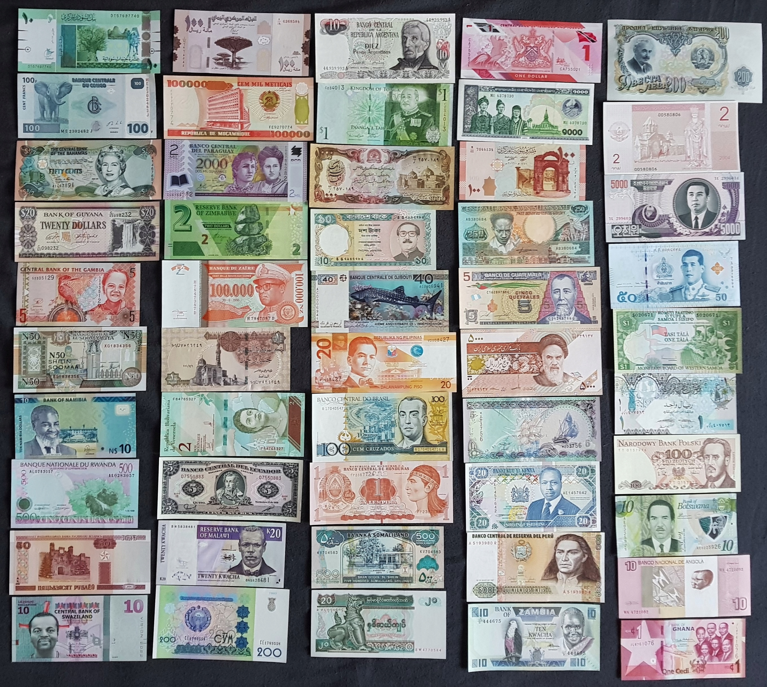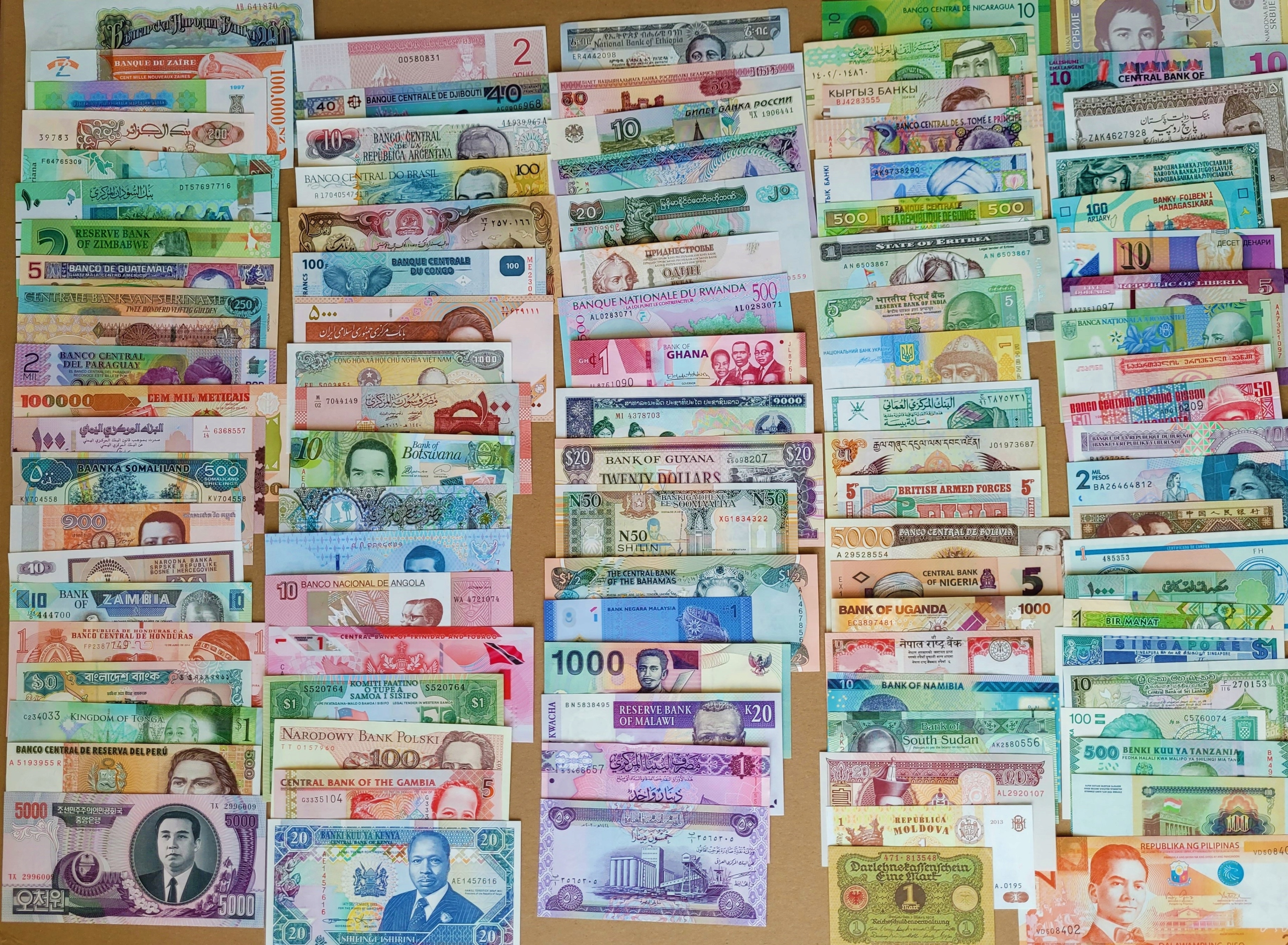 ⭐ Походження: банкноти походять із рівно 100 країн із таких континентів: Південна Америка, Азія , Європа, Африка