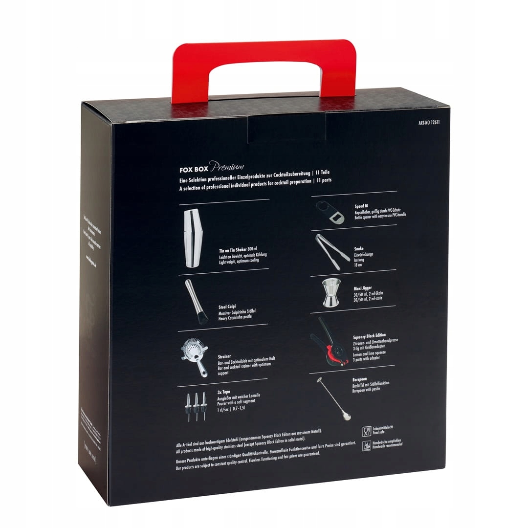 Набір для бармена Fox Box - це повний набір напоїв, який містить цілих 11 практичних аксесуарів, необхідних кожному домашньому бармену. Це ідеальна ідея подарунка для любителів напоїв — елегантний, міцний і готовий до дії одразу після розпакування.