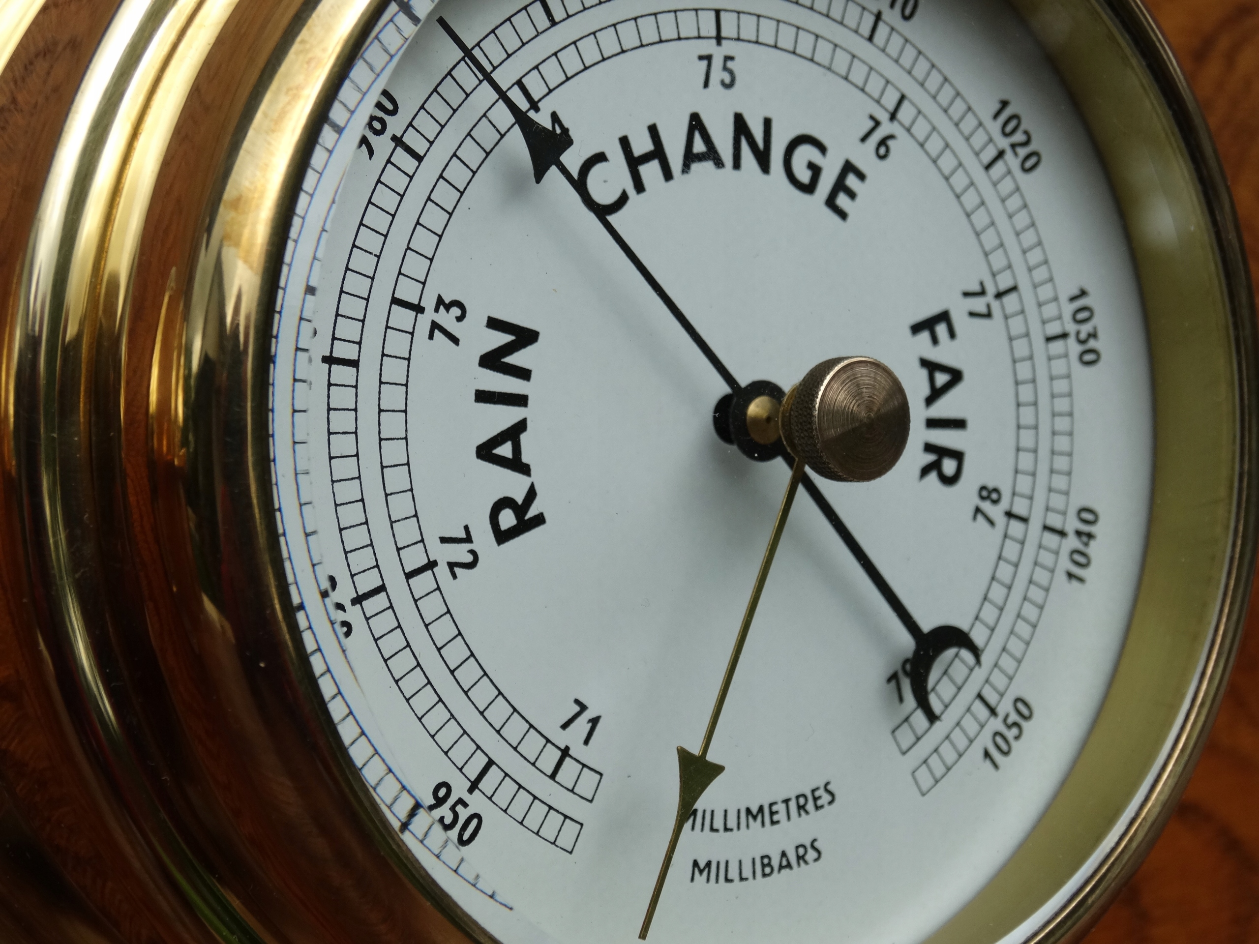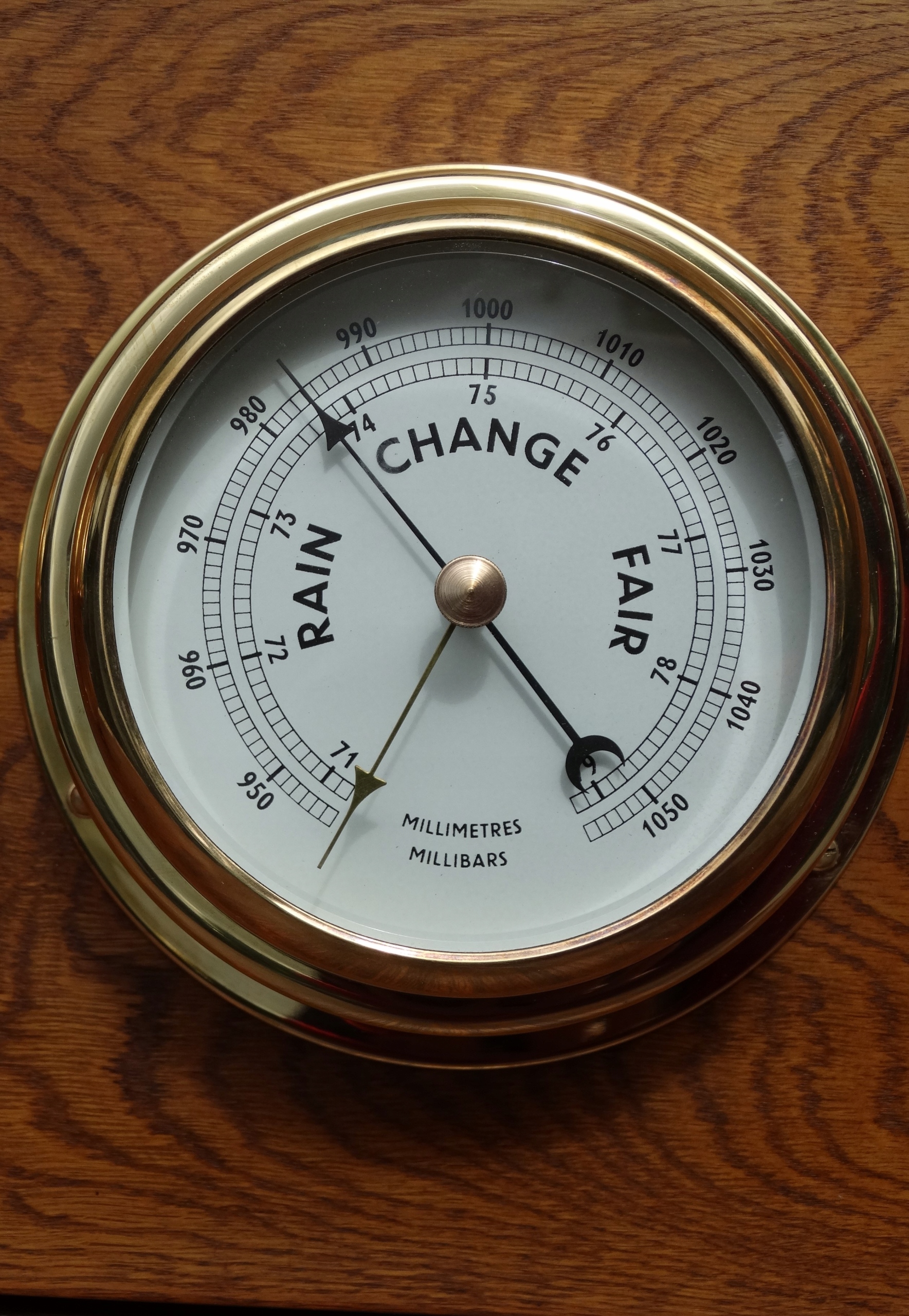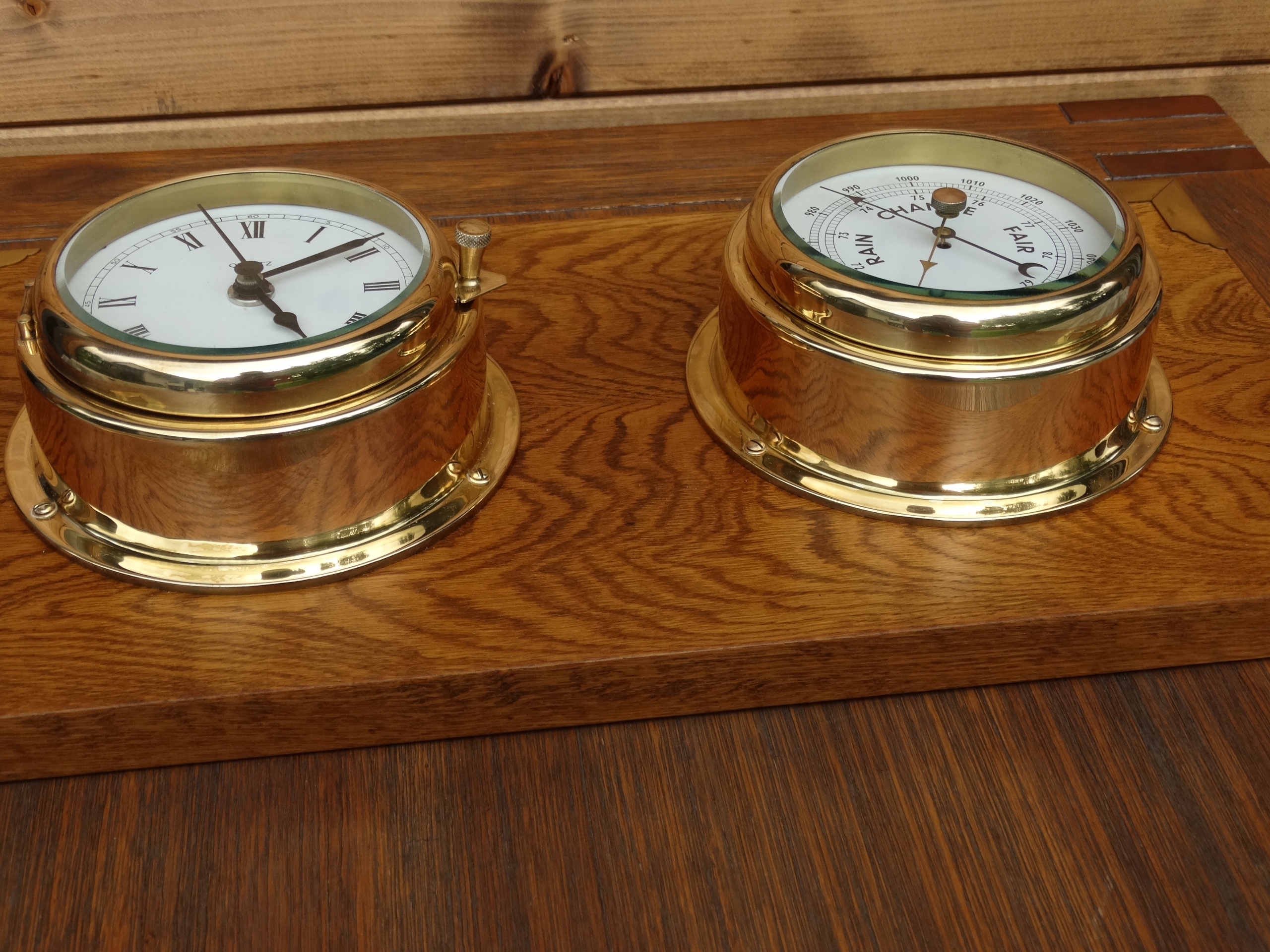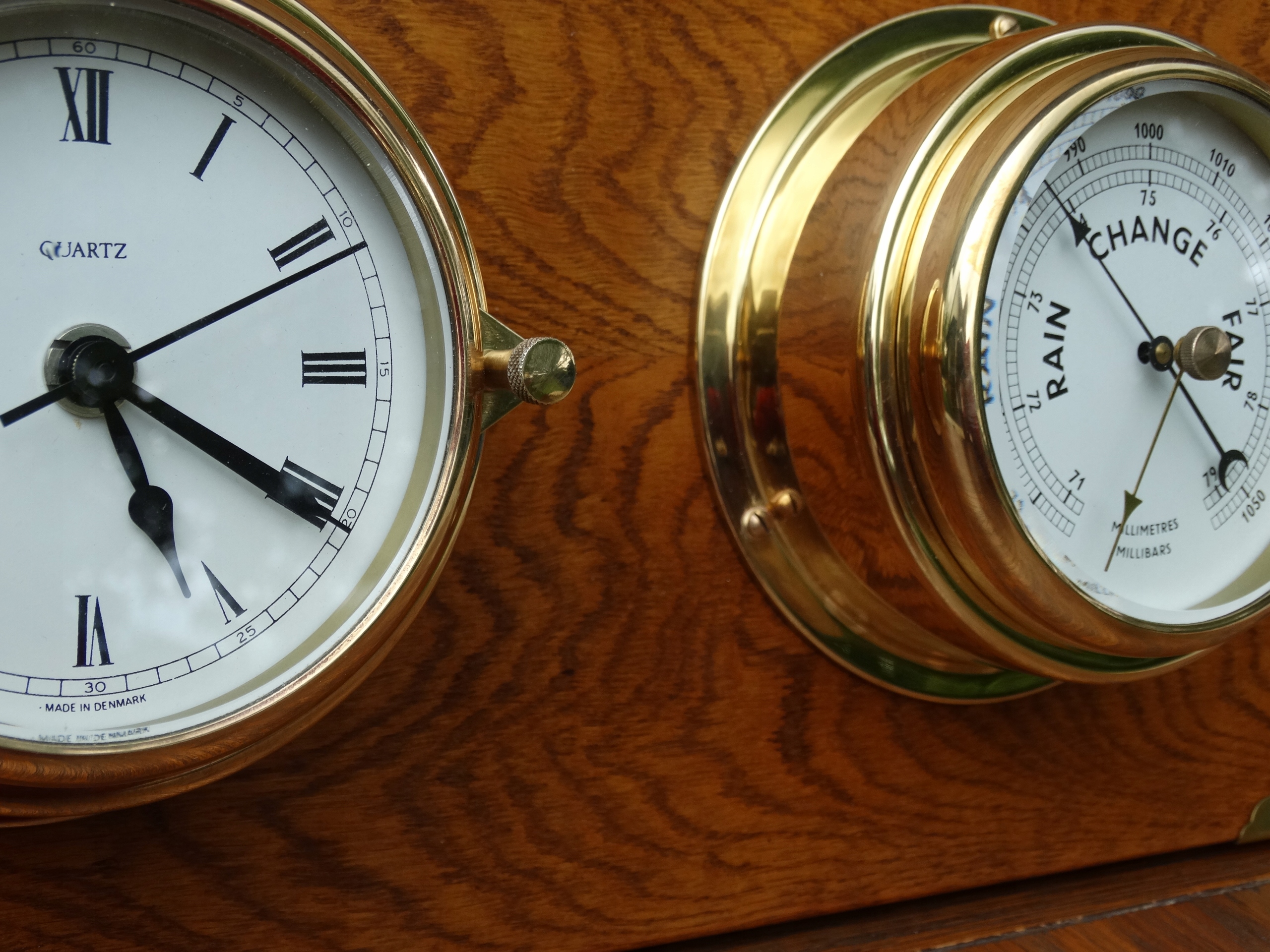 барометр та морський годинник на дерев’яному столі в латунних рамах.