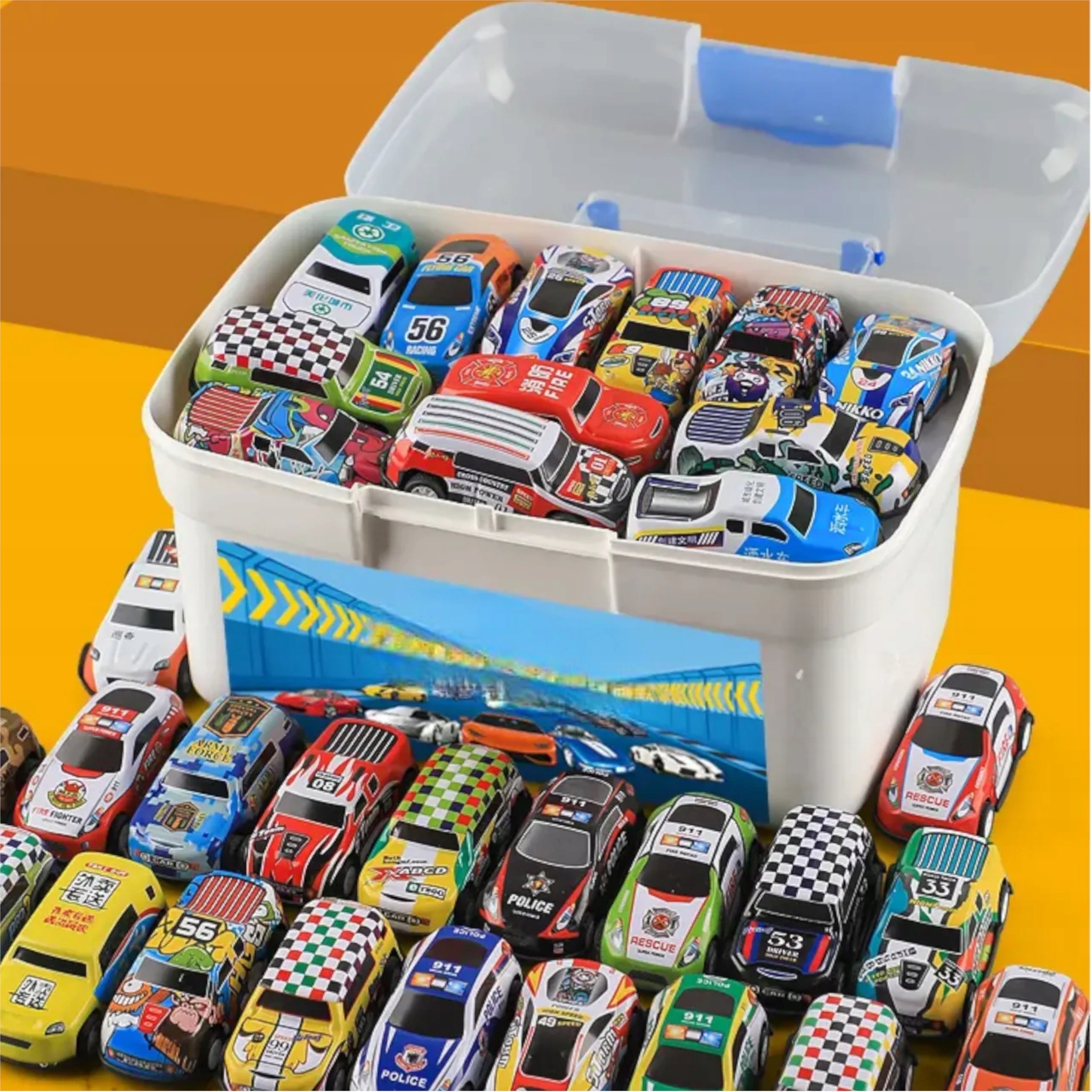 Набір включає 50 автомобілів, поля, поле -офти в різних кольорах та формах. Автомобілі можна керувати завдяки механізму спинного механізму. , щоб покласти машину в рух , просто потягніть її на підлогу і відпустіть.