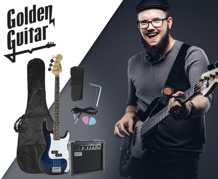 Басова електрична гітара та підсилювач - це ідеально відповідний дует, тому набір також включає компактний підсилювач Golden Guitry Bass, який загальновідомий як "плита". Пристрій пропонує потужність 20 Вт і оснащений 5 '', укладеним у елегантному, класичному чорному корпусі.