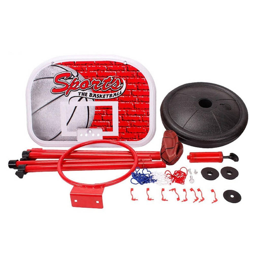 - Набір включає баскетбольний м'яч, основу, стійку, щит, кільце, сітку та насос
