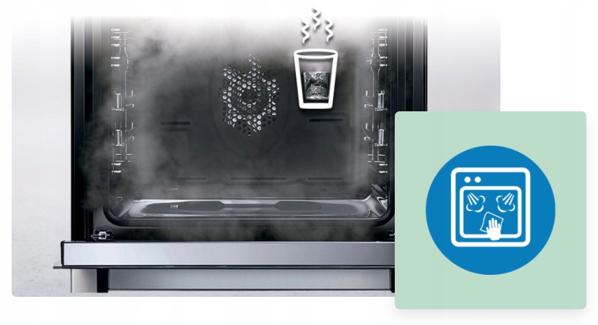 Ви можете легко очистити цю духовку завдяки тихій потужності пари. Просто налийте трохи води в камеру духовки та ввімкніть відповідну програму, щоб пара осідала на стінки, полегшуючи їх очищення.