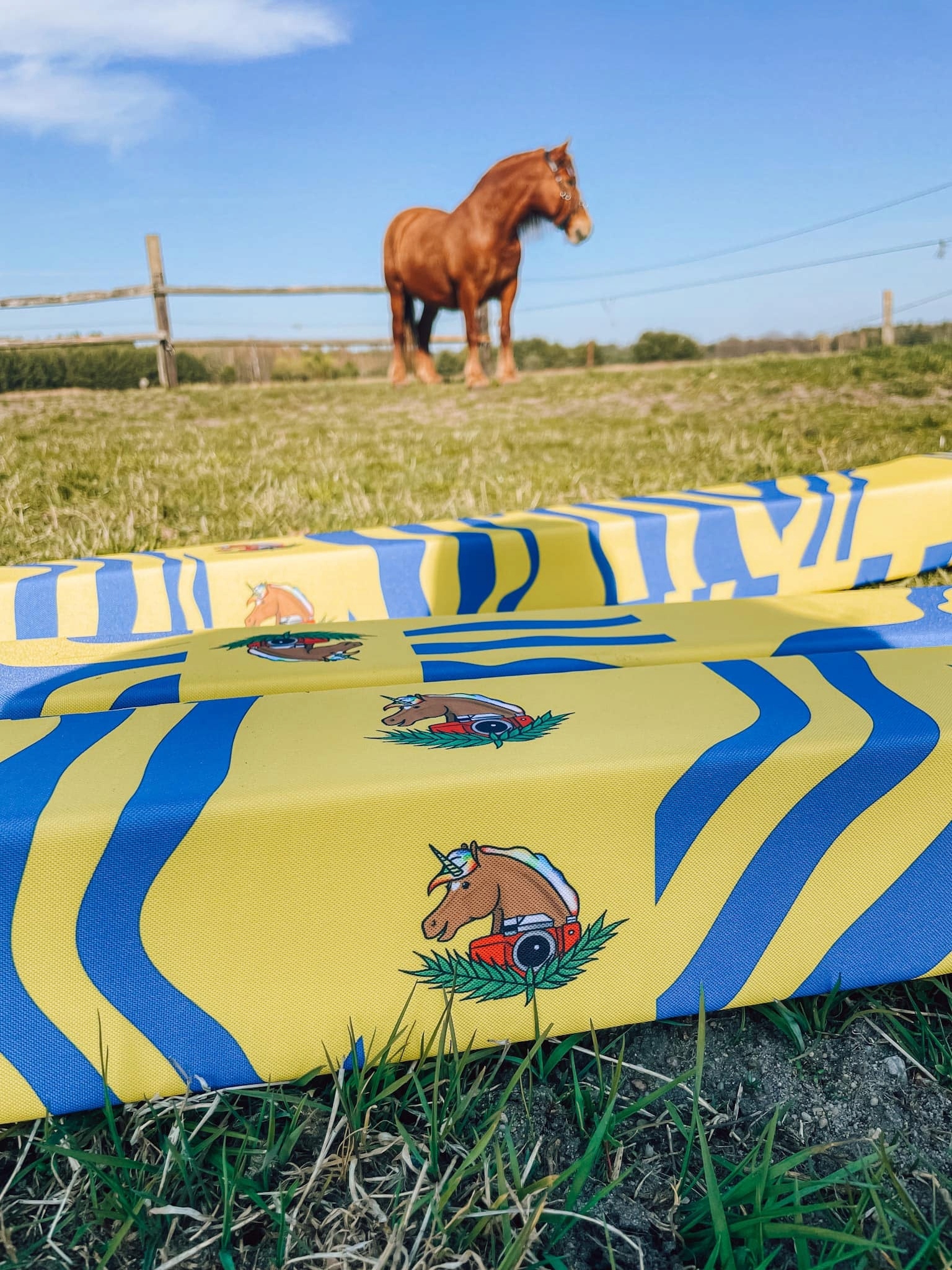 Яскраві кольори або візерунки на полюсах (які ми друкуємо самі) Вони чудово задіюють обидві півкулі мозку коня, які необхідні для розвитку правильних патернів рухів.