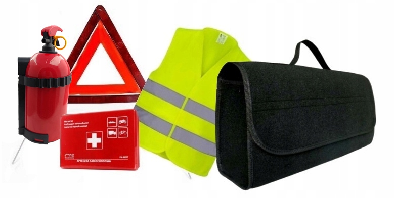Вогонь -вогнегасник автомобіля, комплект першої допомоги, попереджувальний жилет, трикутник та сумка липучок