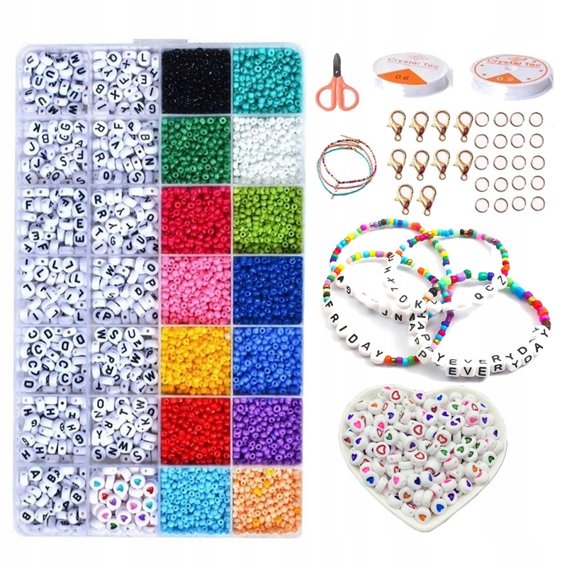У набір входять маленькі намистини 14 кольорів, 13 відділень з літерами, намистини з сердечками, силіконова гумка на бобіні двох товщин, ножиці, ланки та застібки.