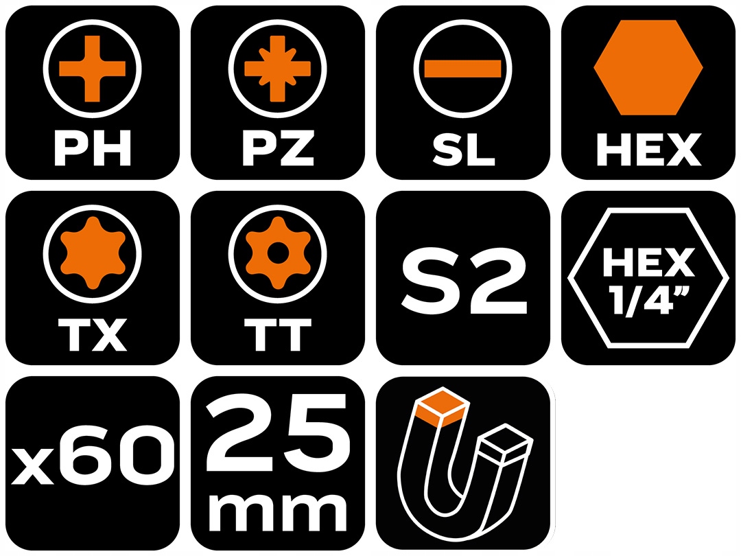 Набір біт, 60 штук 56-600 фірми NEO TOOLS складається з профілів біт: PH, PZ, SL, TX, TT, HEX; виготовлений зі сталі S2. У набір входить 58 біт довжиною 25 мм, магнітний тримач 1/4" HEX довжиною 65 мм і подовжувач 1/4" HEX довжиною 60 мм. Конфігурація набору забезпечує сумісність зі стандартними тримачами 1/4" HEX.