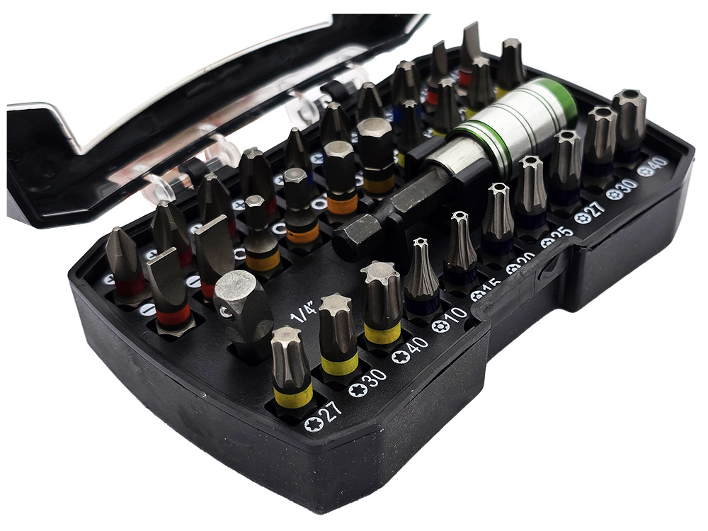 Набір біт це аксесуар, який пропонує різні типи біт для використання. Кожен наконечник має власний окремий колір, що полегшує їх ідентифікацію. Він також маєпідвісну ручку.