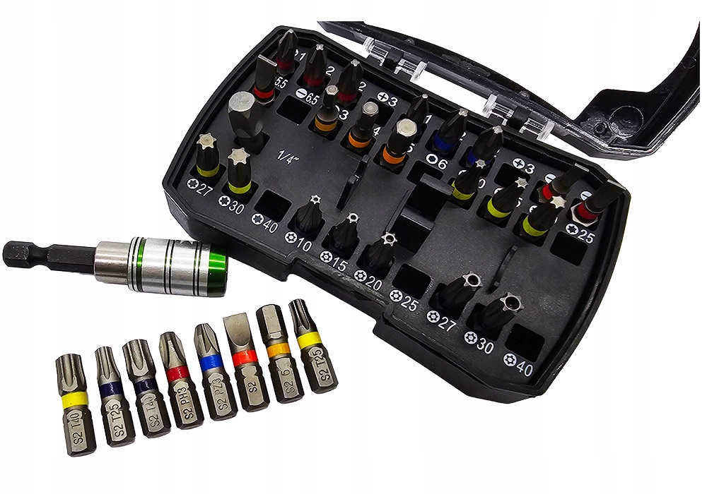 Навіть якщо комплект не закритий, ризик випадання елементів дуже низький завдяки встановленим розеткам. Кожен отвір також маркованийікожен тип наконечника має власнийколір для легшого пошуку.