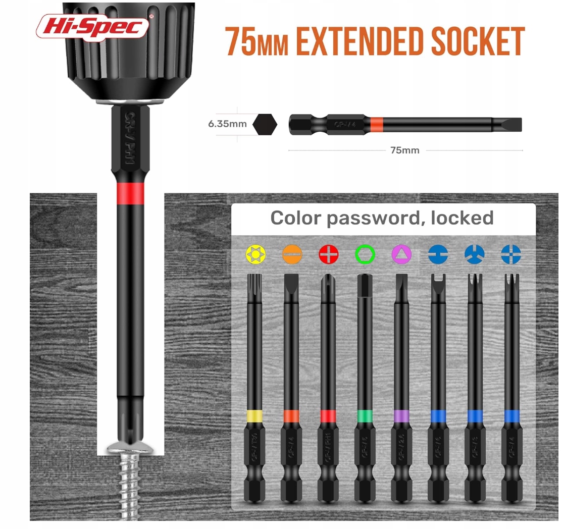 - Адаптер для свердла: Довжина 50 мм, сумісний із шестигранними наконечниками 1/4"