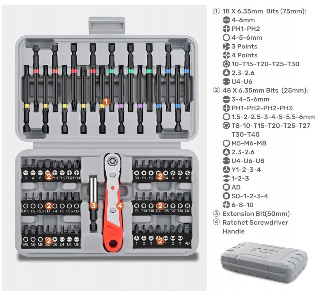 - Біти 25 мм: 48 частин: SL, PH, Hex, Security Torx, XZN, Triangle, Tripoint, Clutch, Square, Torq