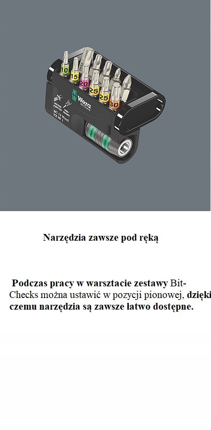 Набір біт із тримачем для біт, особливо корисний для обробки дерева. Насадки 867/1 TORX® HF завдяки своїй особливій геометрії надійно утримують гвинти TORX® відповідно до специфікації інтелектуальної власності Acument на інструмент! Корисно у важкодоступних місцях, де тримати гвинт іншою рукою неможливо. Також призначений для профілів Würth ASSY і Altenloh SPAX T-STAR plus. З системою пошуку інструментів Wera "Take it easy": кольорове кодування бітів за розміром. Тримач Rapidaptor з кільцевим магнітом для утримання довгих і важких гвинтів. Набір Bit-Check дозволяє швидко переглядати доступні інструменти. Біти, які більше не використовуються, можна просто повернути в набір, виключаючи ризик їх втрати. Легке транспортування, наприклад, у кишені сорочки. Bit-Check можна розмістити на робочій станції, що забезпечує швидкий доступ до інструментів.