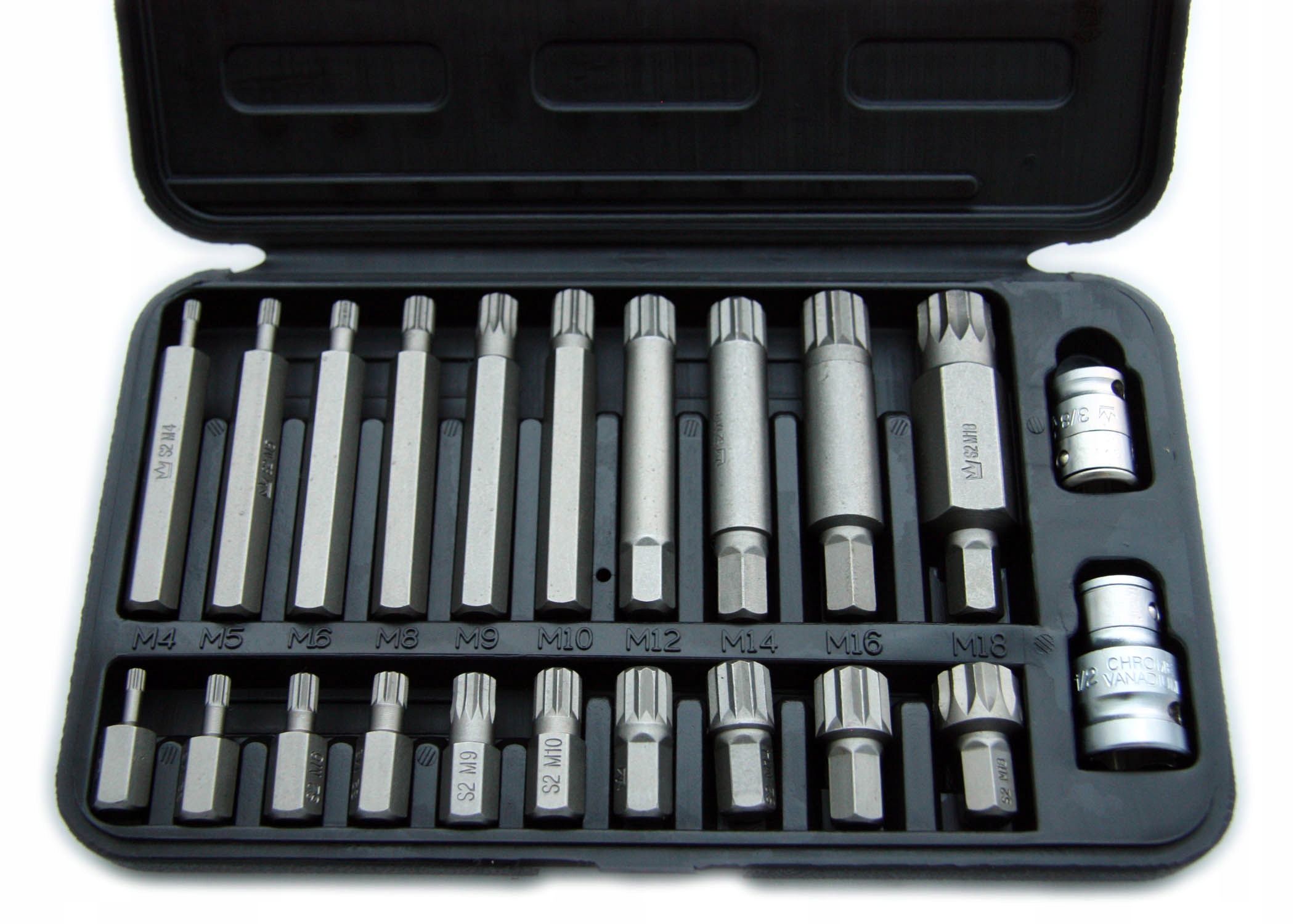 Набір гайкових ключів SPLINE довжиною 30мм та 75мм у розмірах: M4, M5, M6, M8 , M9, M10 , M12, M14, M16 (з отвором), M18 від Corona Exclusive. Матеріал S2.